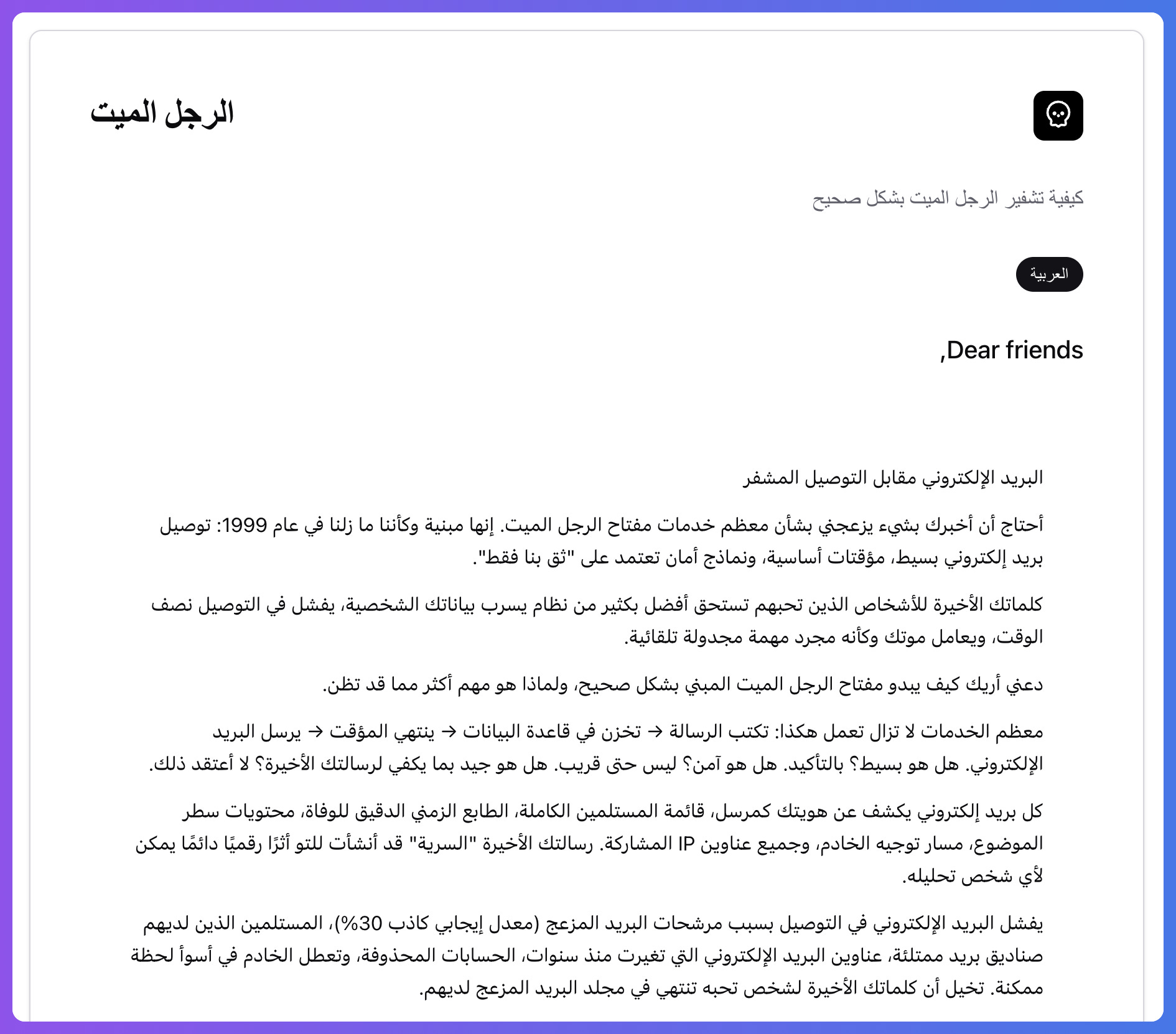 Delivery got more durable. — When the time comes and your death note needs to be sent, that process now runs through a proper job queue. Each delivery attempt is tracked, retries are automatic, and nothing gets lost between steps. The system knows exactly what was sent, what is pending, and what needs another try.