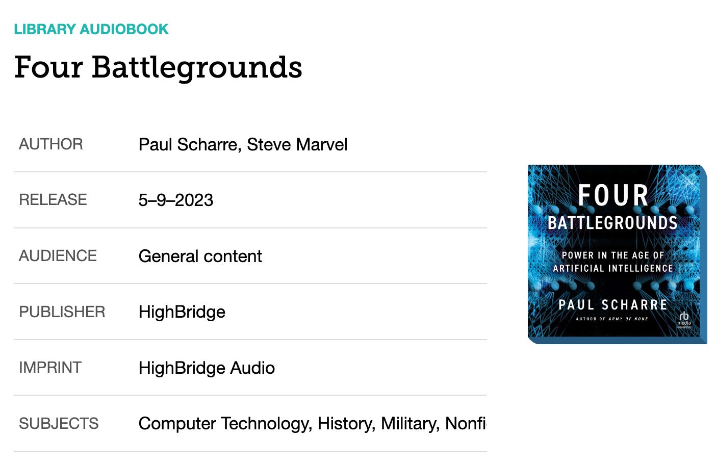 Autonomous weapons expert Paul Scharre takes listeners inside the fierce competition to develop and implement this game-changing technology and dominate the future. Four Battlegrounds argues that four key elements define this struggle: data, computing power, talent, and institutions. Data is a vital resource like coal or oil, but it must be collected and refined. Advanced computer chips are the essence of computing power-control over chip supply chains grants leverage over rivals. Talent is about people: which country attracts the best researchers and most advanced technology companies? The fourth “battlefield” is maybe the most critical: the ultimate global leader in AI will have institutions that effectively incorporate AI into their economy, society, and especially their military.