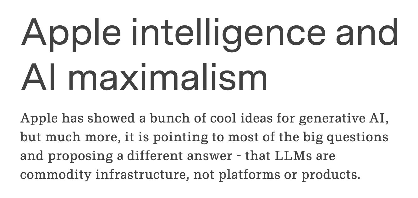 As I said at the beginning, that’s really the single core question about the future of Generative AI - is this a new general purpose tool, where one product from one company does the work of hundreds of pieces of software from hundreds of companies, or is this a generic technology that will enable features inside products from hundreds or thousands of companies?