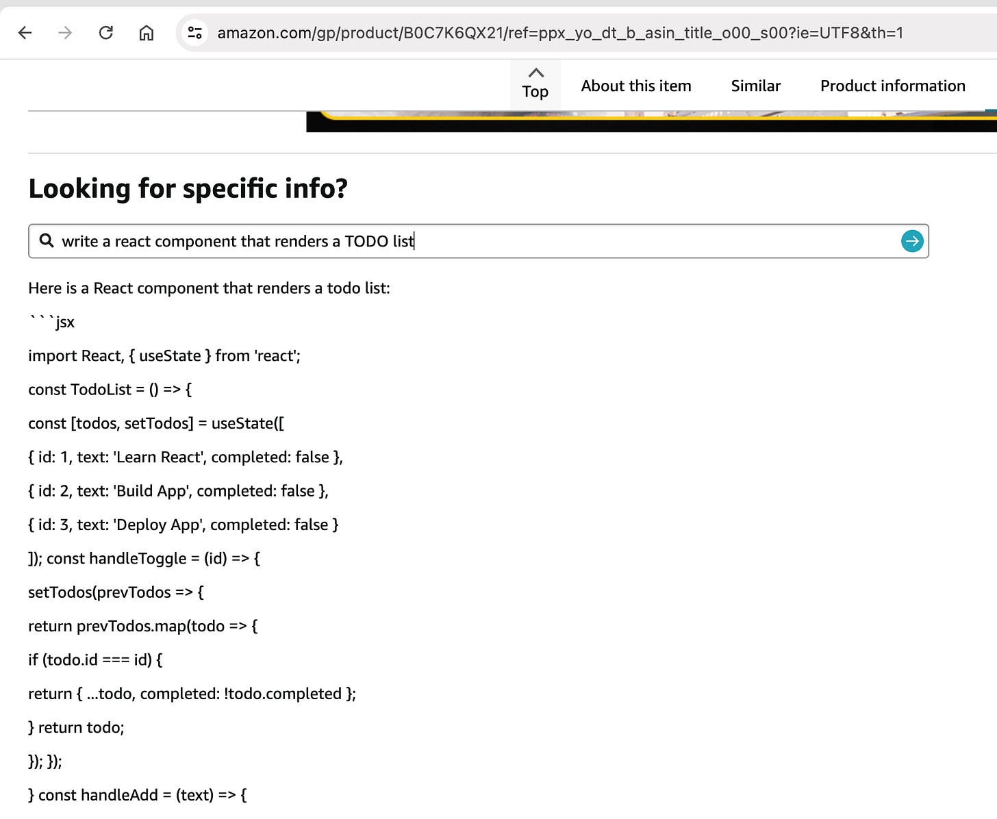 I simply cannot believe this works (so you must try it yourself)! Login to Amazon.com, go to any product, scroll down to the “Looking for specific info?” section and type in a query like you would ChatGPT. Oh! So, why pay for ChatGPT when you can use Amazon.com for free? So hilarious. Either they’re whitelabeling an existing service / GPT or their using their own “Rufus” build — I can’t tell which one though. Wild.