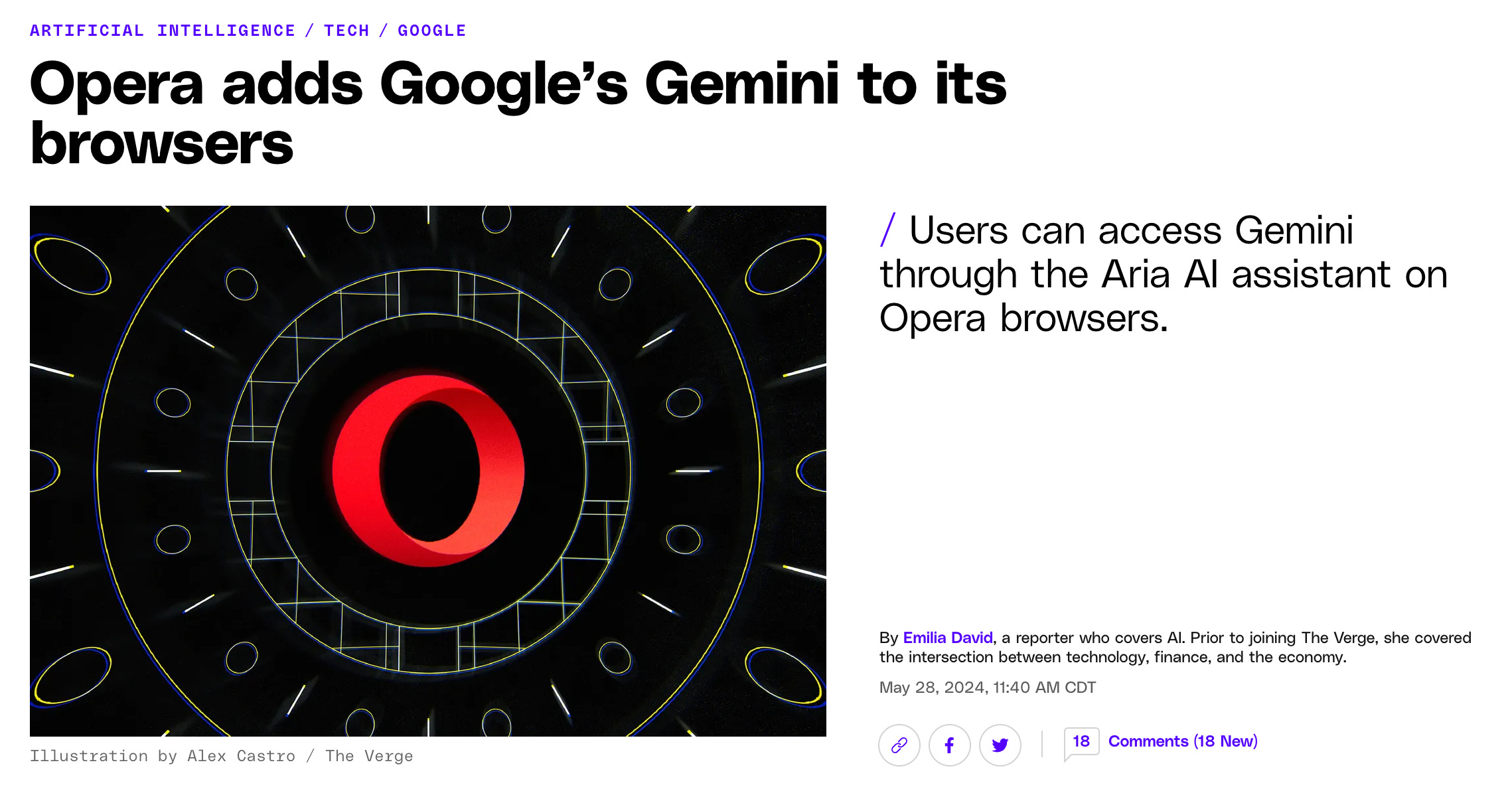 Opera browser has integrated Google's Gemini AI models into its Aria AI extension, providing more up-to-date information and conversational responses.