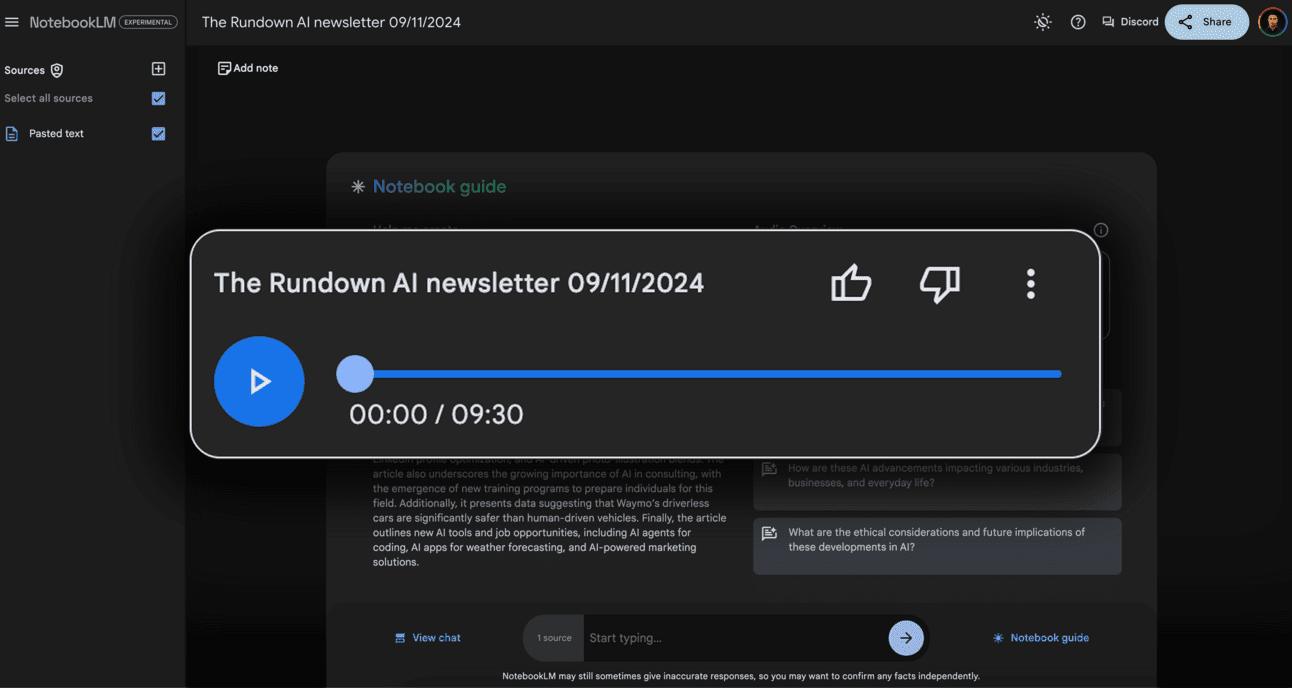 Google launched Audio Overviews that turns notes, PDFs, Google Docs, Slides, and more into AI-generated audio discussions between two virtual AI agents. Fun.