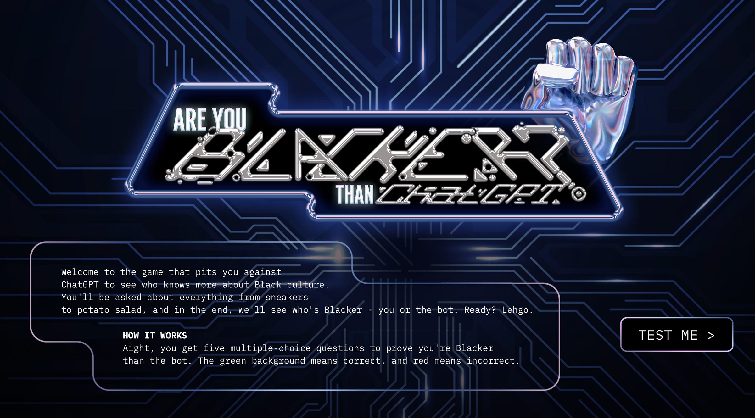 Naturally, there are some folks are doing what they can to expose inherent bias and one example that came across my desk yesterday was this one called “Are you Blacker than ChatGPT” seems tongue-in-cheek but is actually a quiz game developed by an ad agency to test a person’s knowledge of Black Culture against what ChatGPT has been trained to know about the black community: