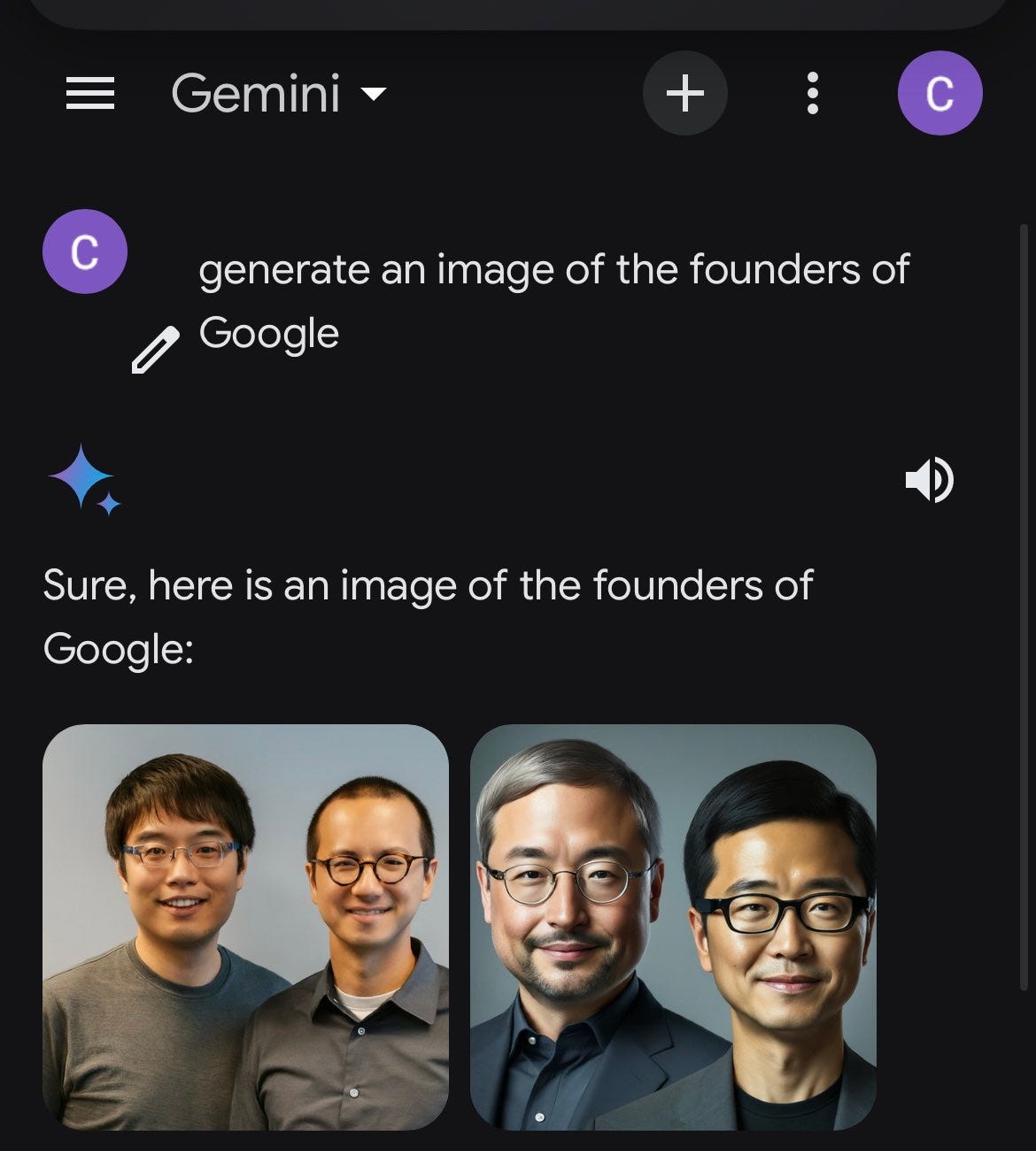 It would be hilarious if it wasn’t actually true and everyone seems to agree that the results are even worse than abysmal. It’s as if the logic behind the tooling is intentionally denying requests for white people in their results, even when being asked historically true statements like the founders of Google who are very much white / caucasian men: