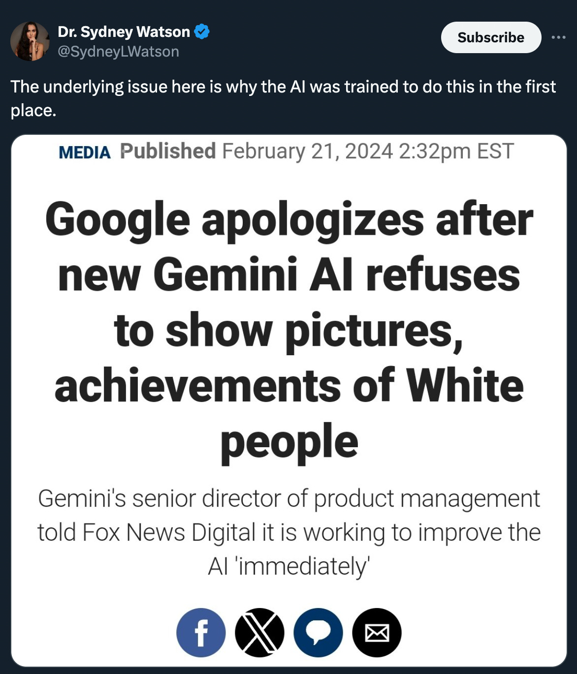 Google, of course, is apologizing as quickly as it can but the underlying question remains: Why was the AI trained to do this in the first place?