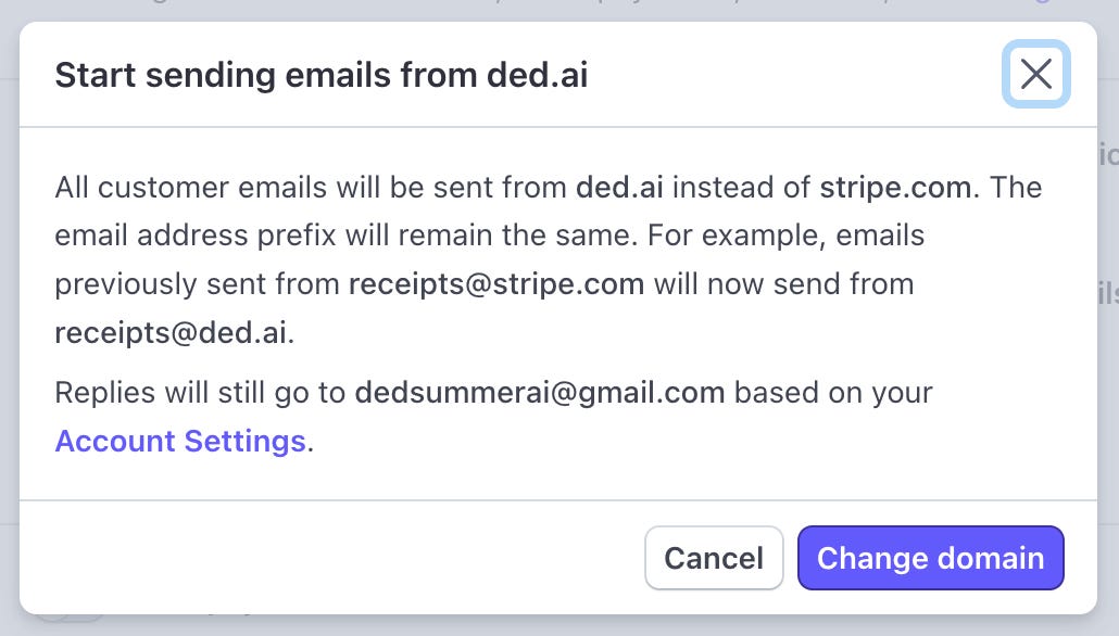 Although this wonderful surprise did make me realize that I should probably review some of the Stripe integration settings and so I spent an hour tidying things in the backend, even going as far as making sure I have a canonical domain (DED.ai) send emails so it looks even more professional: