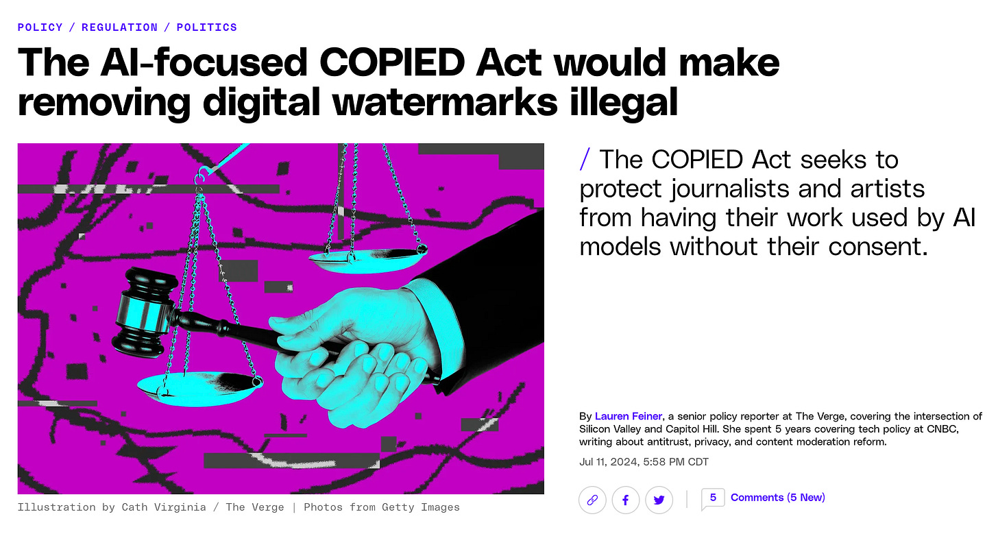 The COPIED Act seems to protect journalists and artists from having their work used by AI models without consent. Removing watermarks would also become illegal.