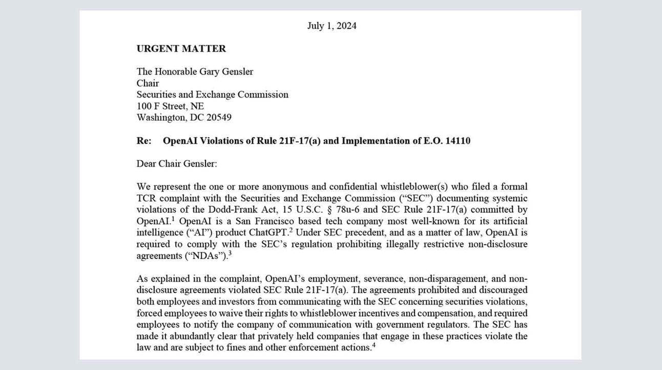 Whistleblowers just filed a complaint with the SEC alleging that OpenAI used overly restrictive non-disclosure agreements to prevent employees from reporting concerns to regulators, violating federal whistleblower protections.