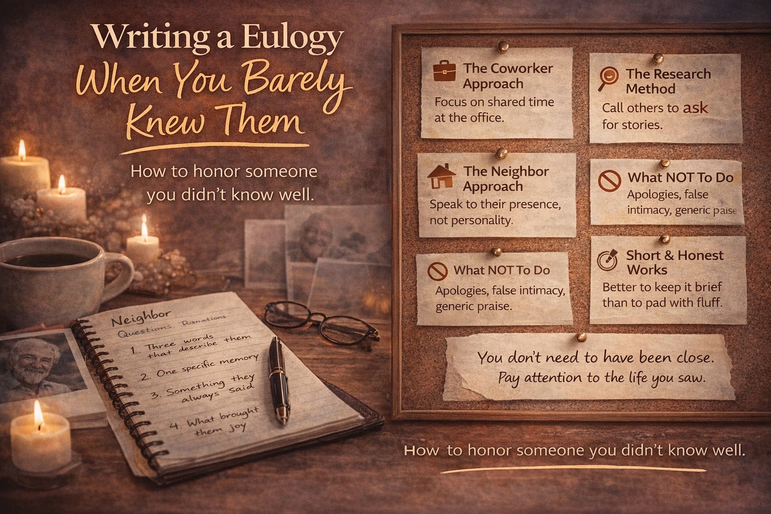 The approach: Community eulogies work best when they focus on presence rather than personality. You did not know their inner world, but you knew what it felt like to have them in yours.