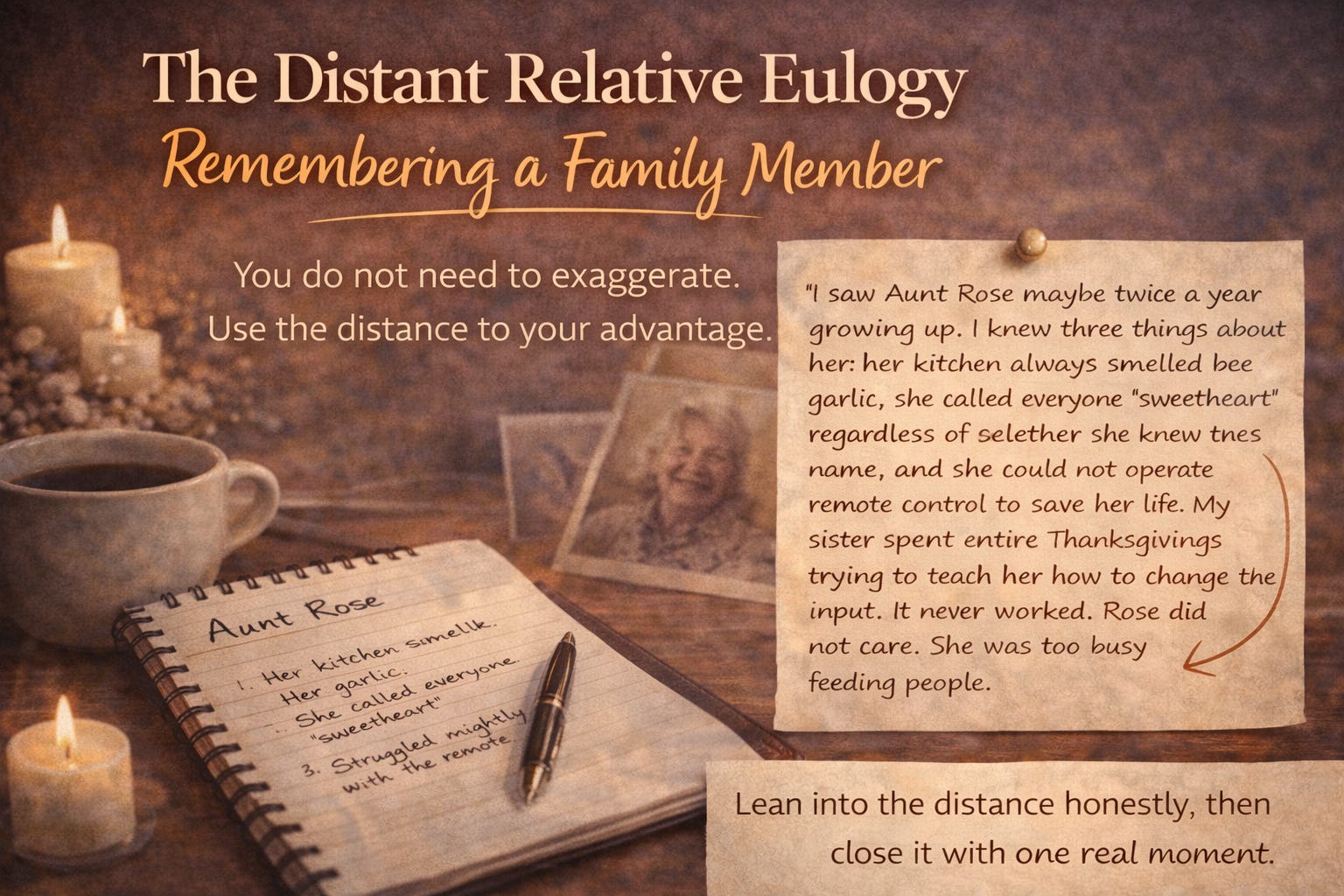 Do not pretend you were closer than you were. The family knows. The room knows. False intimacy is worse than honest distance.