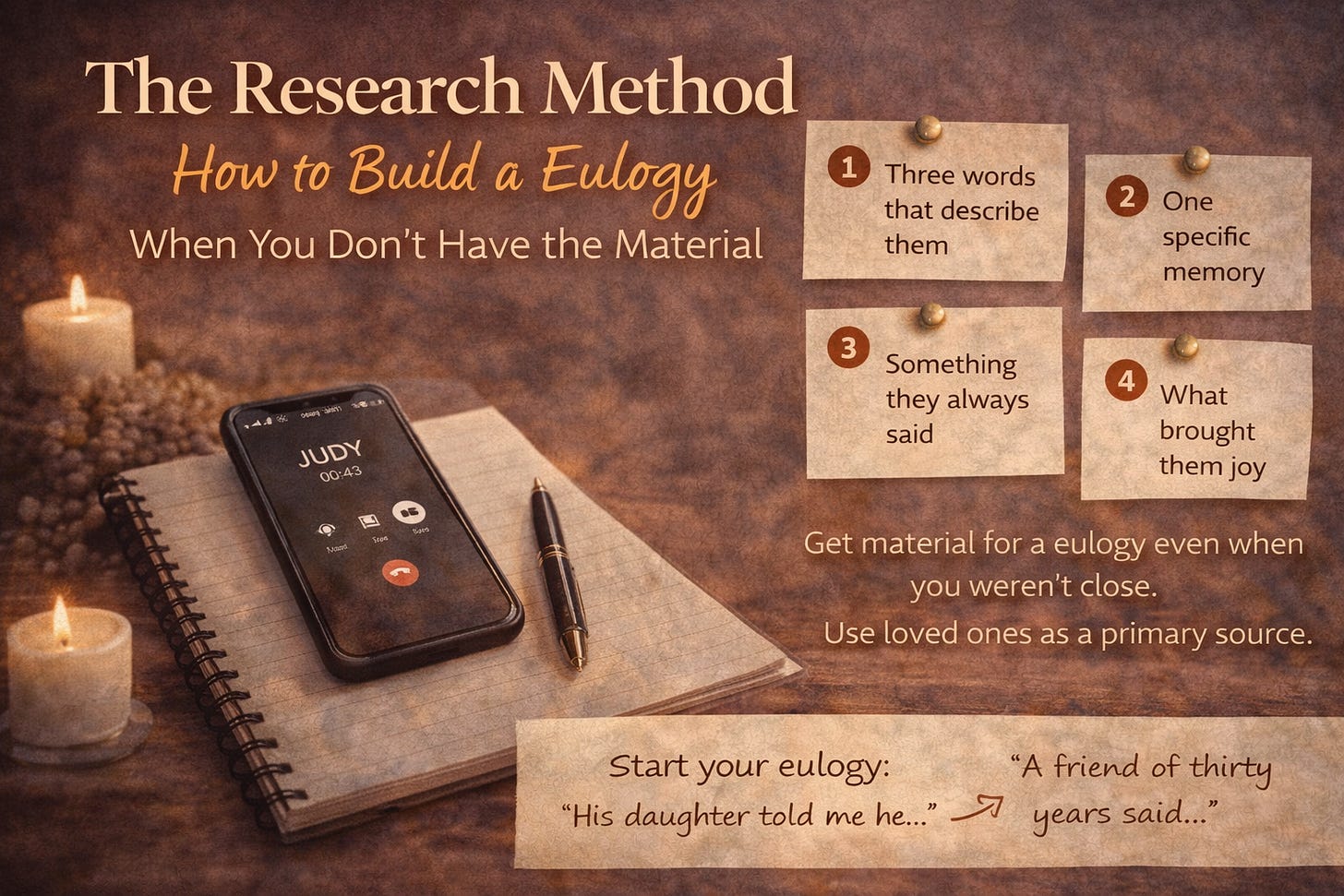 The worst eulogies I have ever encountered are not the short ones. They are the ones where someone had 3 minutes of real content and stretched it to 8 with filler. The room can feel the padding. They start thinking about the parking meter.