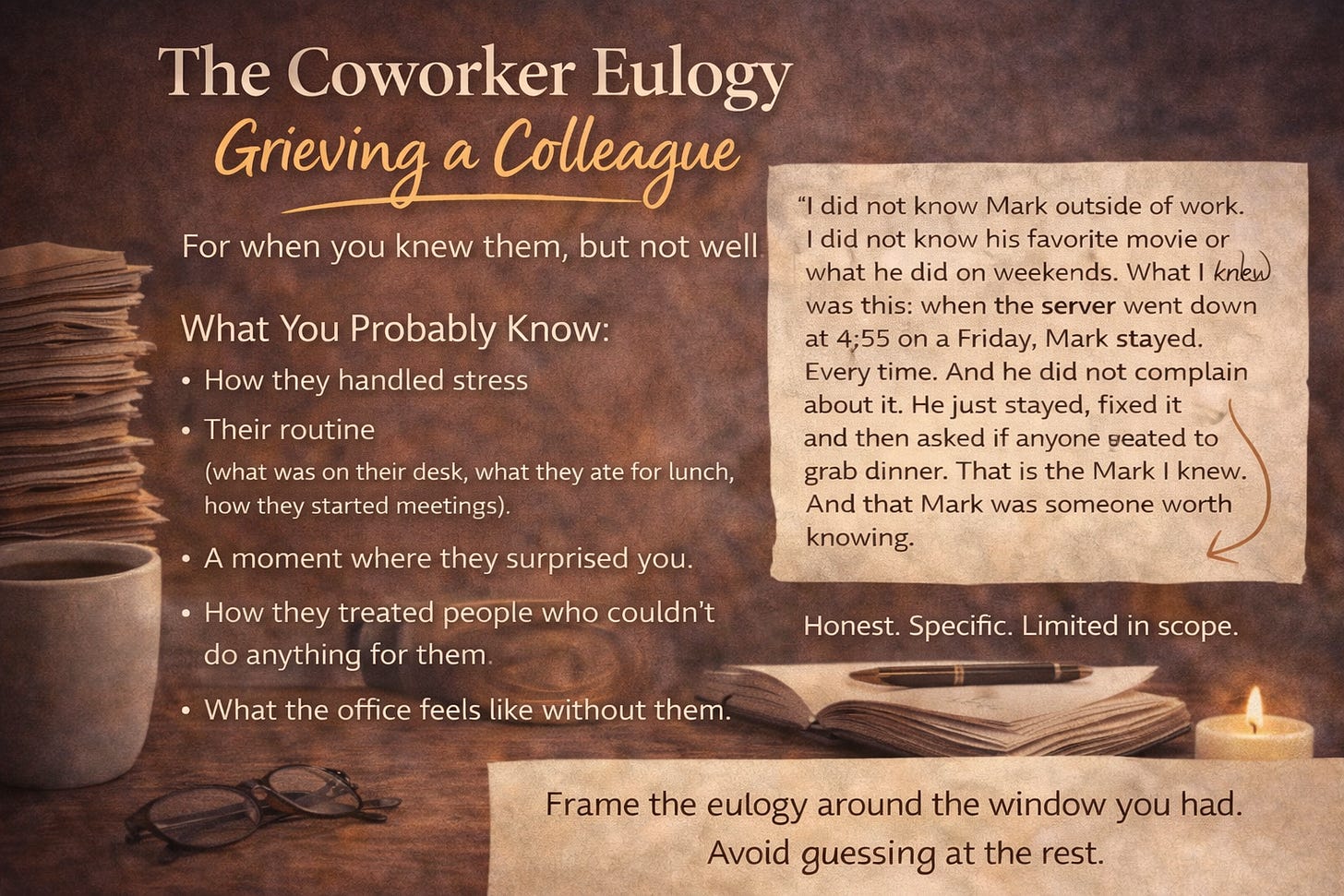 This is the most common version of the “barely knew them” speech. You worked with someone for years. You sat in meetings together, ate lunch in the same break room, exchanged pleasantries. Then they died and you realized you knew them well enough to miss them but not well enough to describe them to a stranger.