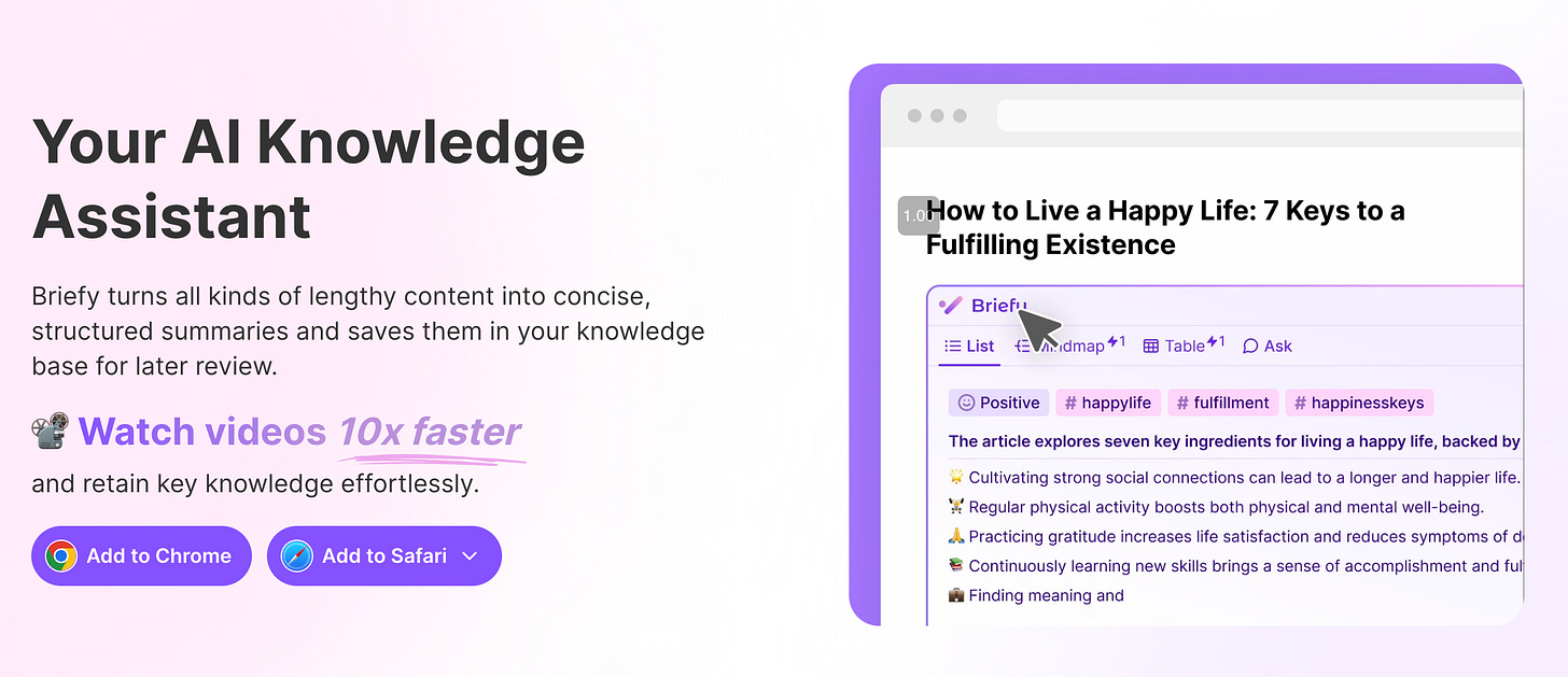 Briefy is an AI knowledge assistant that simplifies information consumption. It condenses complex information into summaries, organizes them into a knowledge base, and retrieves knowledge on demand using natural language.