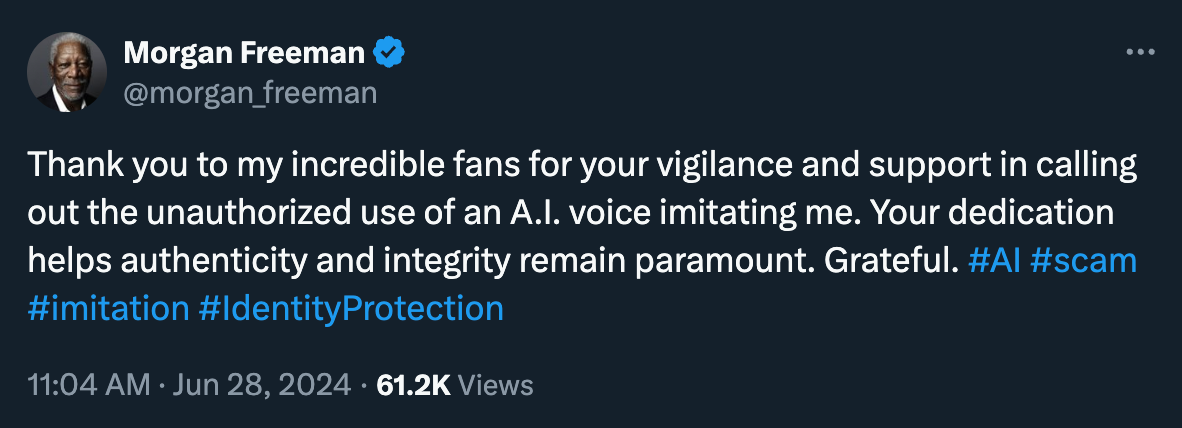 And finally, Morgan Freeman thanked his fans for calling out AI in a scam. I imagine this is going to become more common.