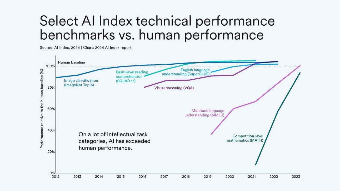 Stanford released it’s 2023 AI Index report and suggests that AI has surpassed human-level performance on significant benchmarks, like image classification, reading comprehension, visual reasoning, and more.