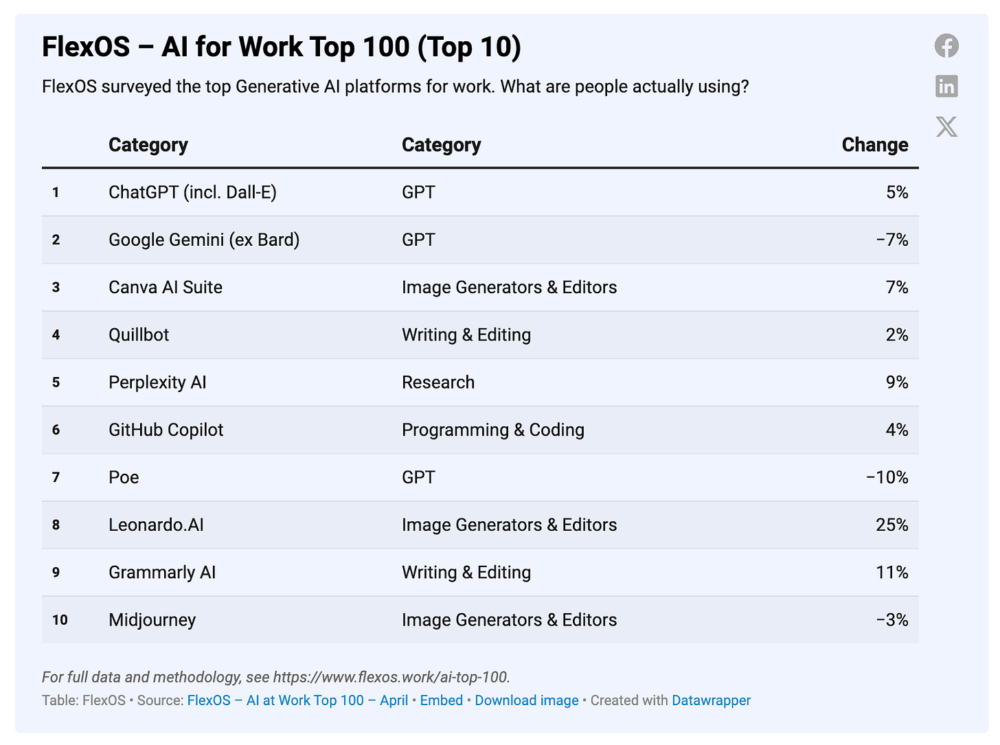 The top 100 generative AI platforms for work. An interesting breakdown of what tools folks are really using to get their work done.