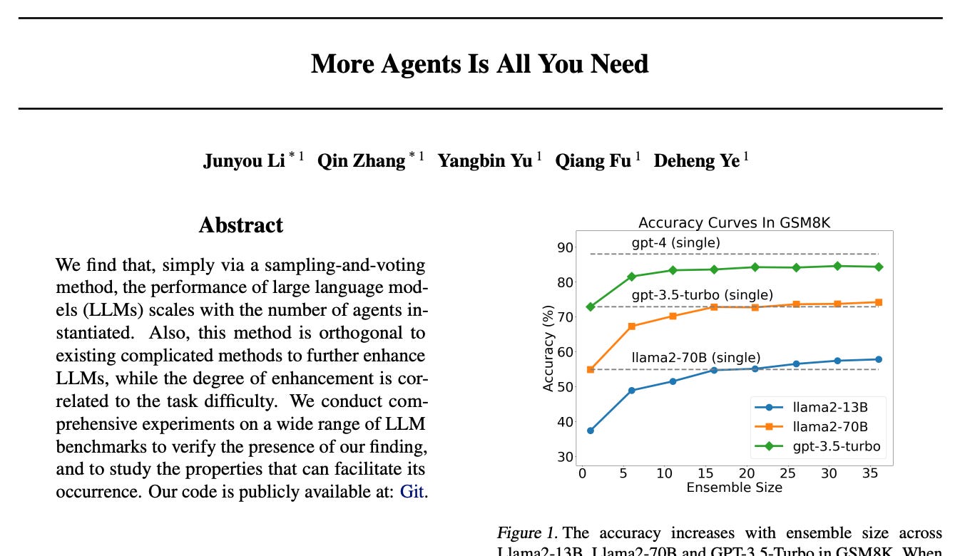 Cornell researchers found that the more AI agents that are collaborating on a problem the more performance you get. Essentially the test was using a voting system to determine the best solution to a problem. Feels democratic in some ways.