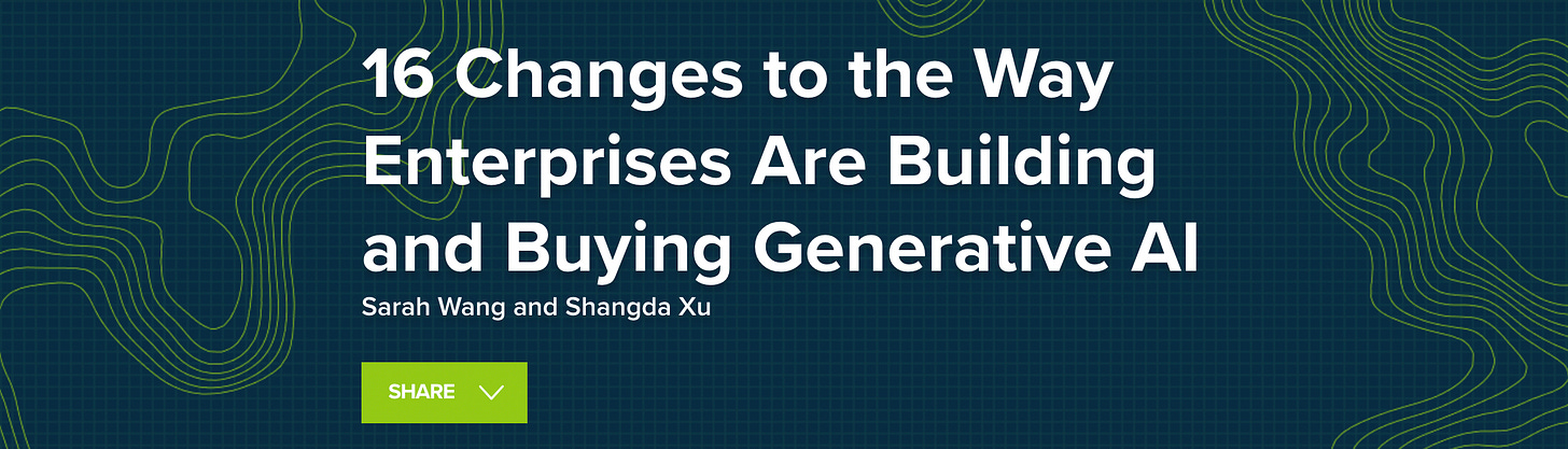 a16z has a survey of 16 ways that enterprises are changing to address the AI opportunities that lay before them. A few interesting high-notes: