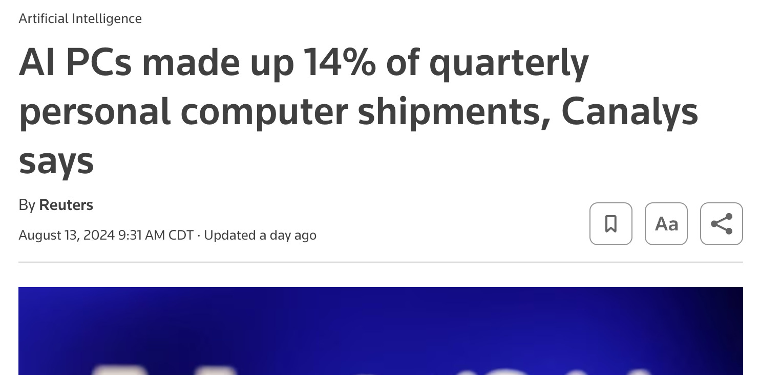 Well, the title says it all: 14% of computer shipments globally were “AI-capable” and I have to imagine most of those were Apple-based since the new ones come with an NPU, besides just a CPU and GPU. I’m running a high-end one myself: