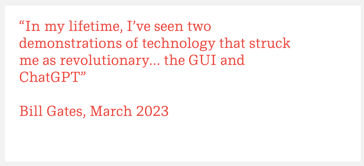 And just like mobile and the web and cloud computing is everywhere the same paradigm is certainly going to play out. It isn’t hard to imagine that most of the tech products that you use (and apps on your phone) will have GenAI components either bolted-on or entirely built-in. In fact I’ve already seen some local