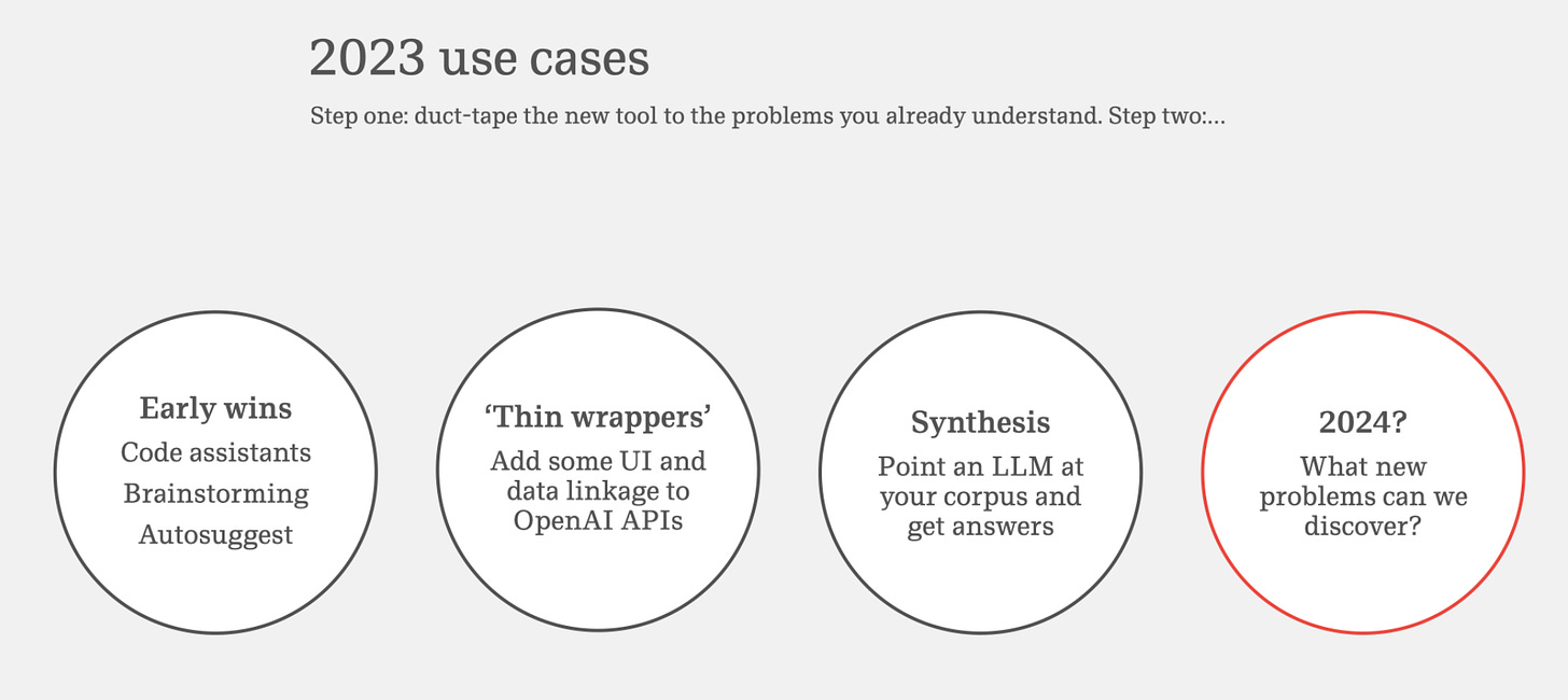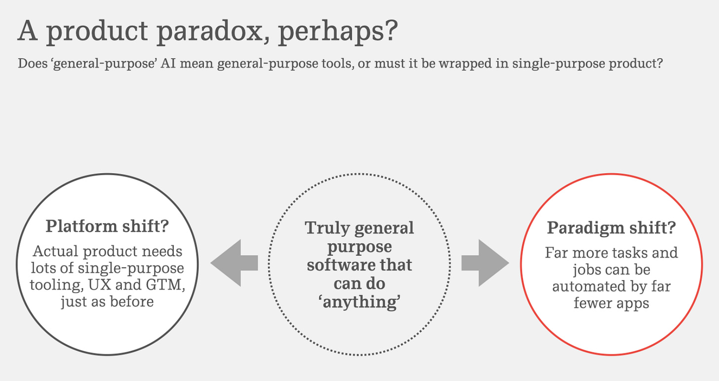 But, like many cold-start challenges, the question is, well, where does one start? If the promise of GenAI is that it can do most (all?) things, then, are there going to be a million of these apps or a few dominant winners? Does it even matter?