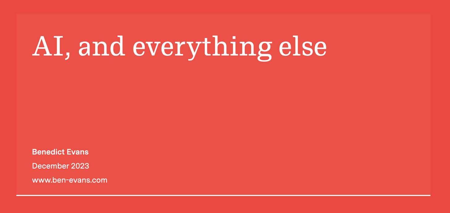 Ben Evans is a well-known venture capitalist who will create cogent and impactful industry-centric presentations that I’ve enjoyed over the many years that he’s been putting them together. I was just waiting for his AI one and he didn’t disapoint.