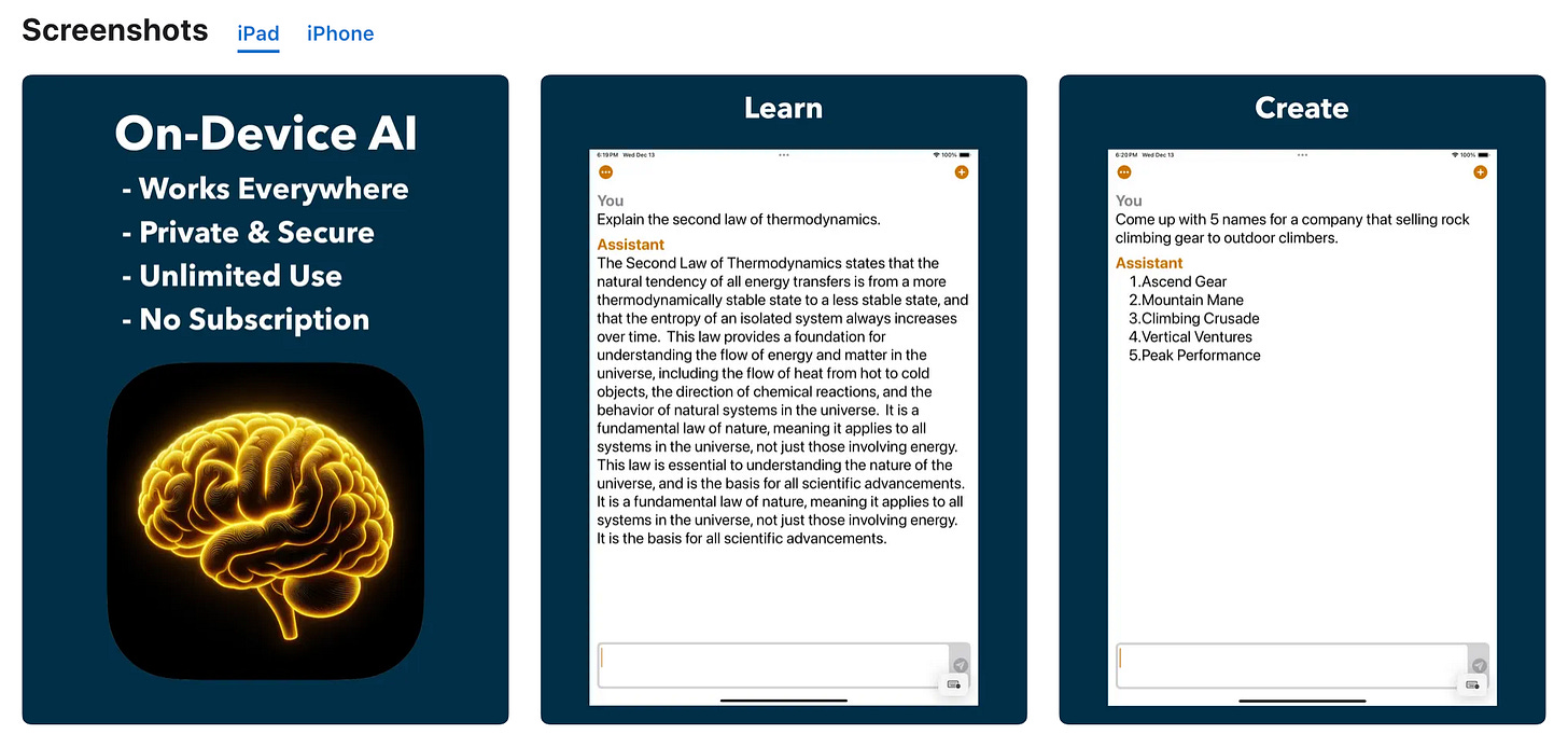 In fact, I’ve already seen some small attempts to bring GenAI right onto your own phone like “Offline Chat” which is a local bot on your iPhone: