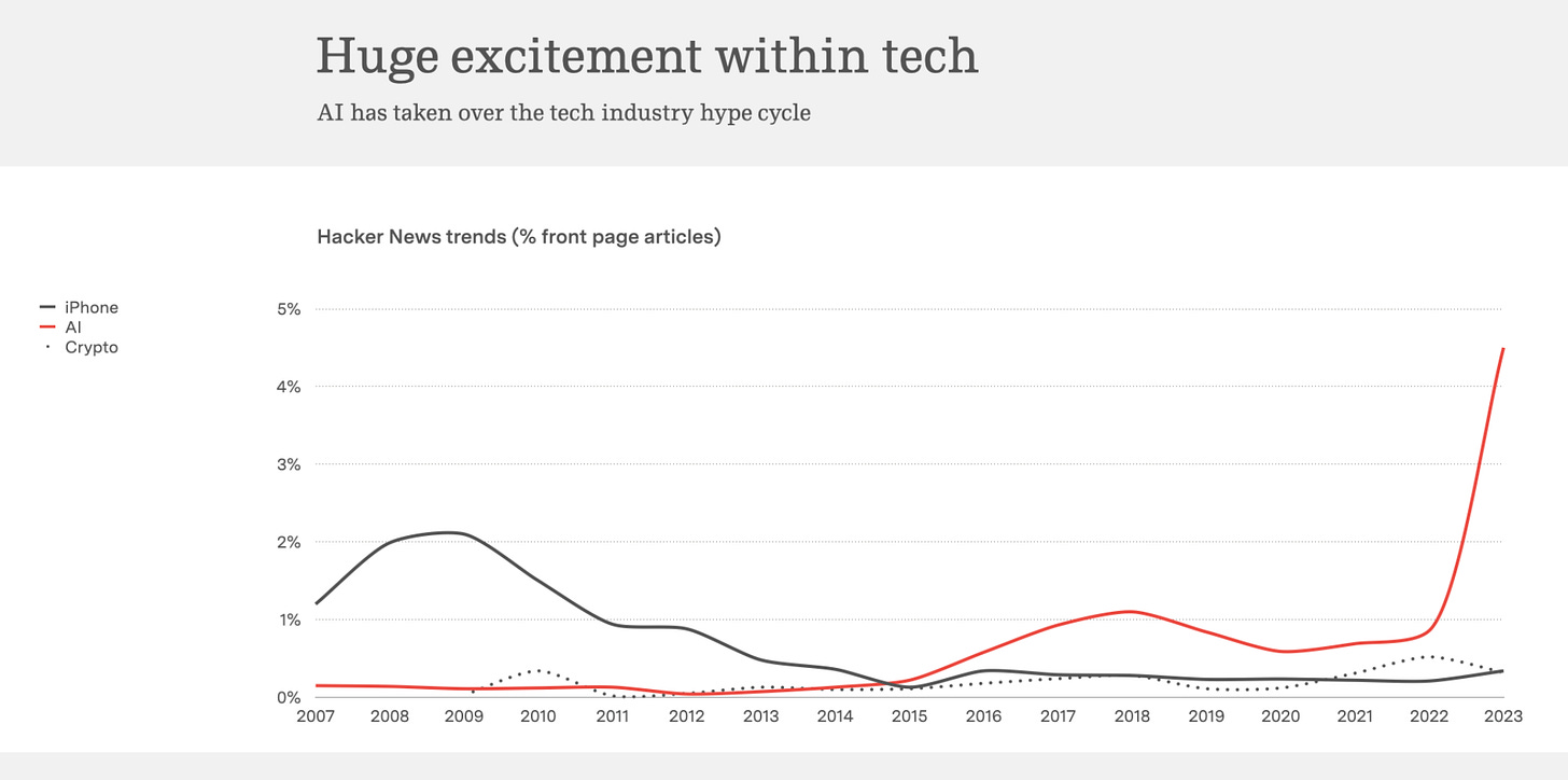 We all know that ChatGPT is OpenAI’s product and it is quite impressive at first blush — if you haven’t given it a go then it’s time to create an account and just fiddle with it and get an idea of what it’s like to “prompt”. The next slide is self-evident and obvious but why this is important (and the data-source specifically) is because the most exciting (modern) technology advancements come from the builders themselves and Hacker News is a key indicator of not just developer and engineering interest but a proxy for venture capital investment, spend, and job creation.