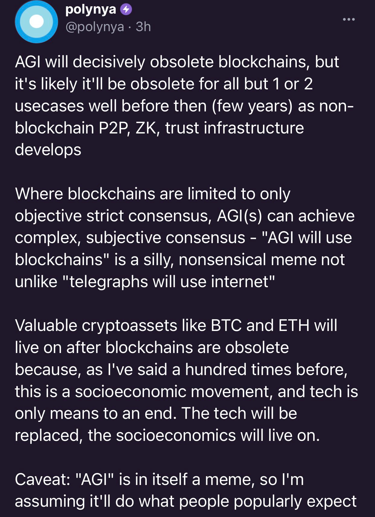 Where blockchains are limited to only objective strict consensus, AGI(s) can achieve complex, subjective consensus - "AGI will use blockchains" is a silly, nonsensical meme notunlike "telegraphs will use internet".