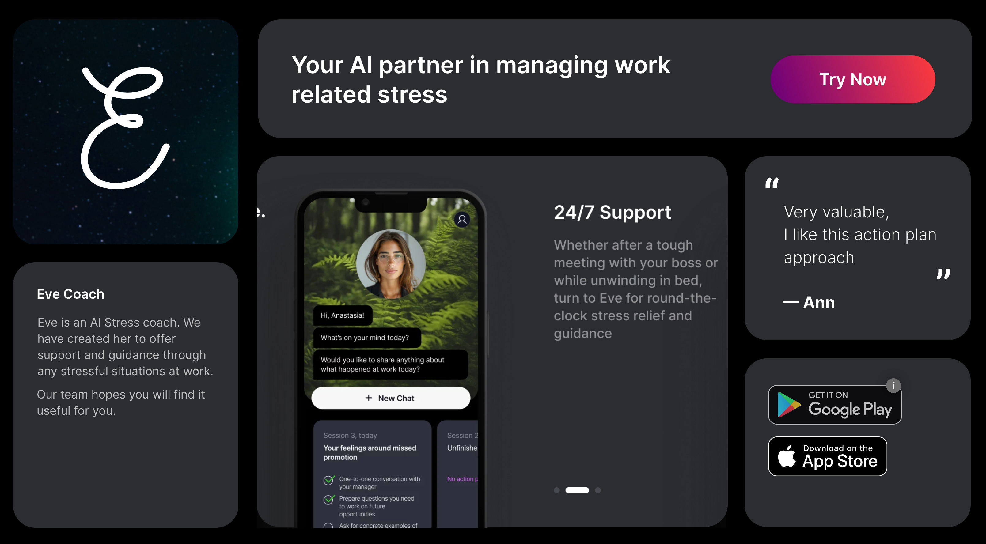 Meet Eve, your trusted AI-powered Stress Coach, combining the warmth of a close friend with the wisdom of an experienced life coach. Navigate workplace stress with ease, as Eve is always ready to listen and empathize.