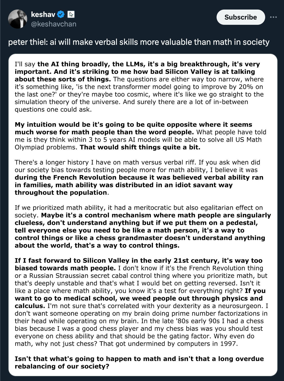 My intuition would be it's going to be quite opposite where it seems much worse for math people than the word people. What people have told me is they think within 3 to 5 years Al models will be able to solve all US Math Olympiad problems. That would shift things quite a bit. There's a longer history I have on math versus verbal riff. If you ask when did our society bias towards testing people more for math ability, I believe it was during the French Revolution because it was believed verbal ability ran in families, math ability was distributed in an idiot savant way throughout the population.