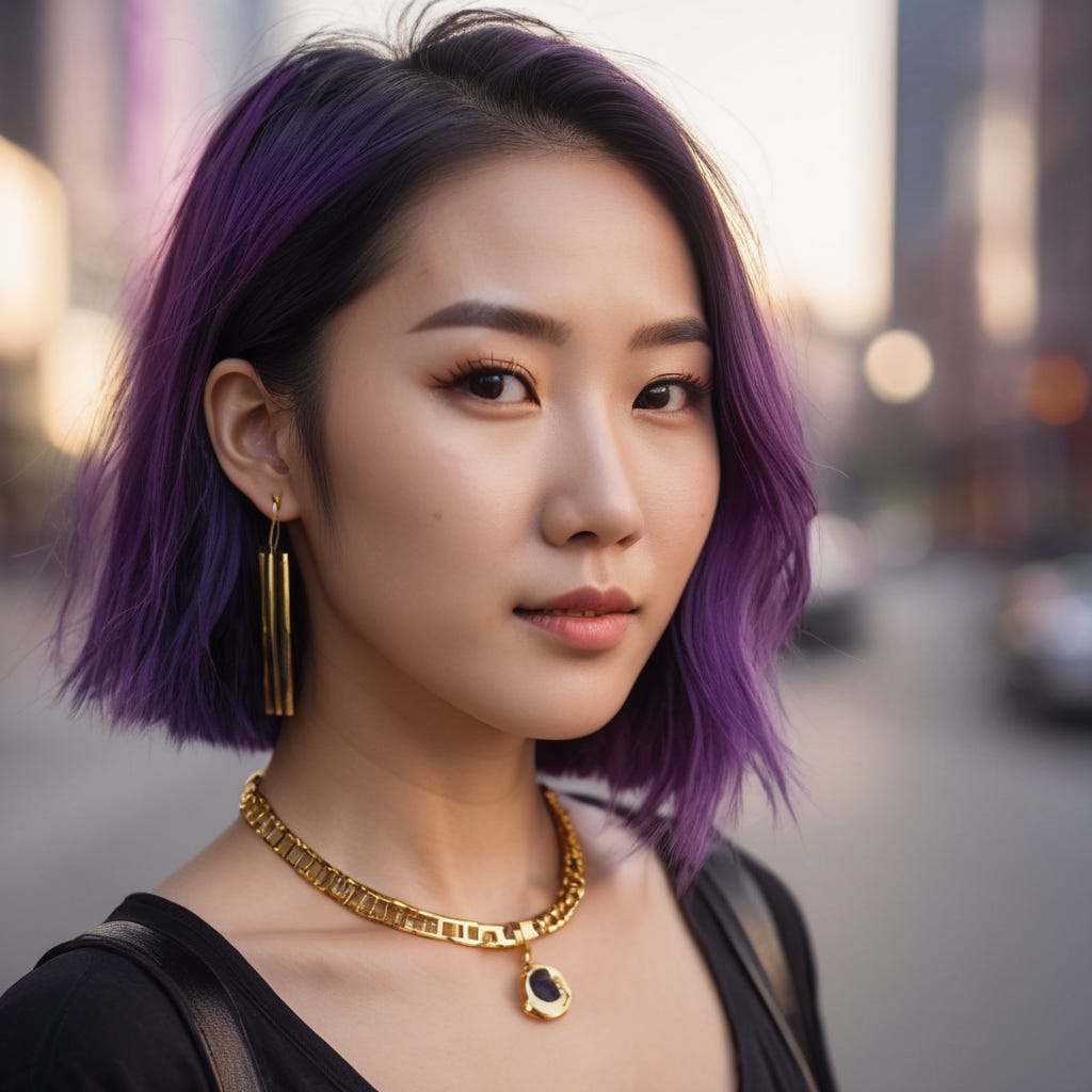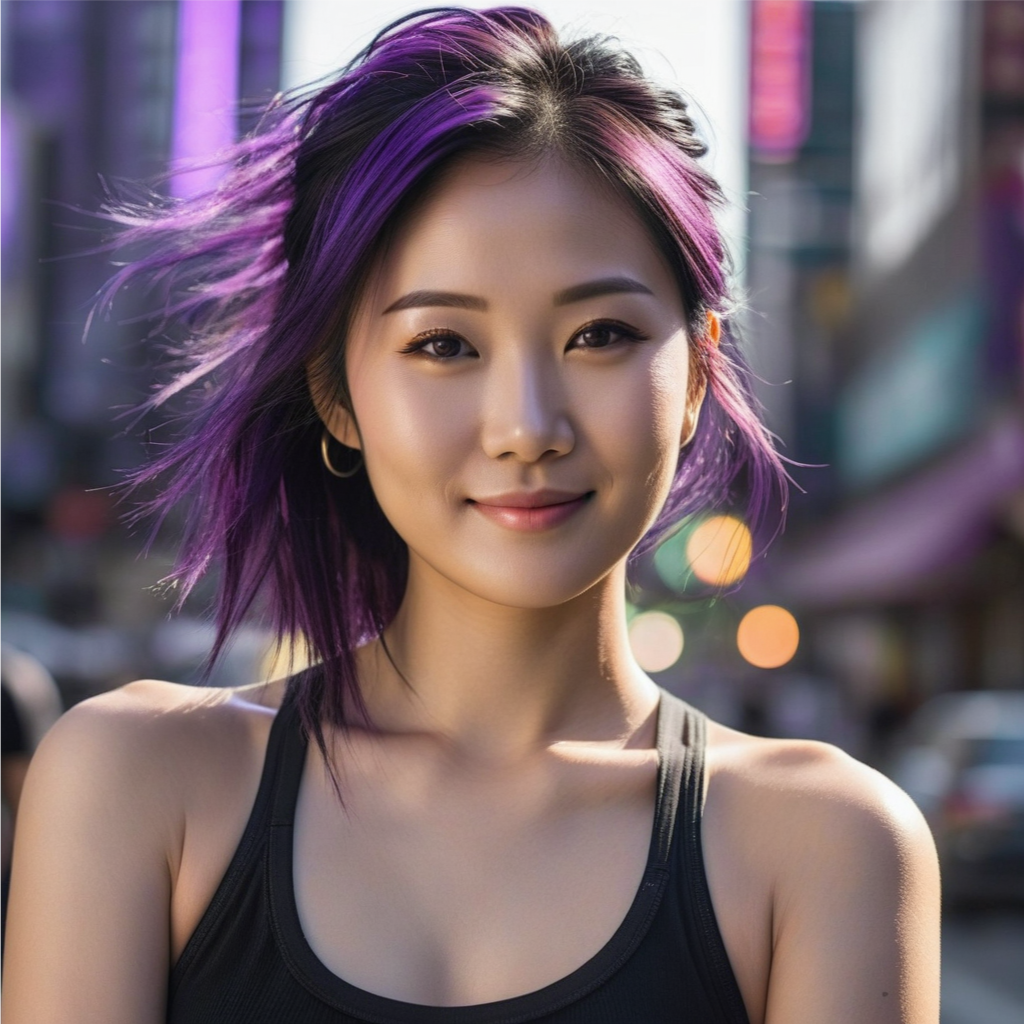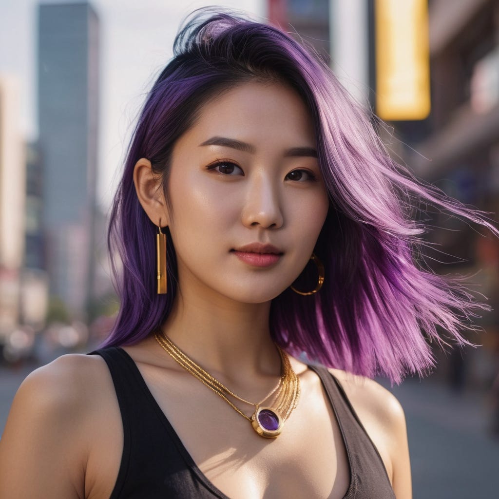 A korean asian 30-year old woman with a purple streak in her hair, portrait style, hyperrealistic, in a cyberpunk city, slightly smiling with the sun behind her wearing a black top with a sun streaks, slightly smiling looking at camera.