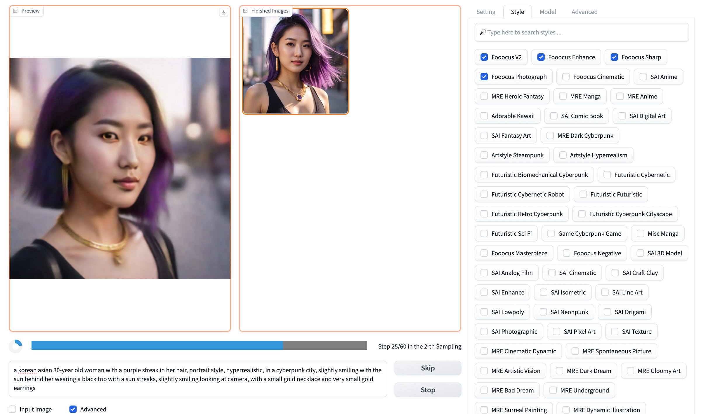 Since I had forgotten a few, small elements that I wanted to include — gold necklace and gold earrings — I also tried the exact same prompt via Stable Diffusion XL (for free!) on my macOS box and got some nice results too. It didn’t take too long to produce although the necklace is a bit large.