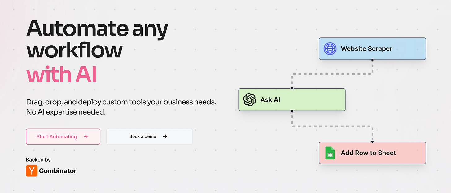 The no-code platform to effortlessly build and deploy AI-powered business automations. Simplify complex tasks with drag-and-drop tools. No AI expertise required.