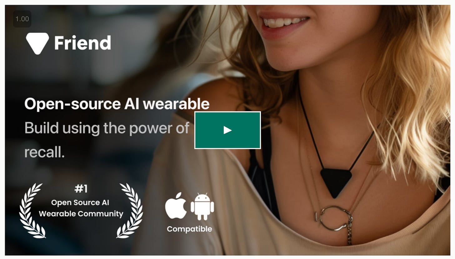 Kickstarter project for an open source wearable AI device. It’s got 230 backers thus far so their campaign is still trying to take off. 29 days to go.