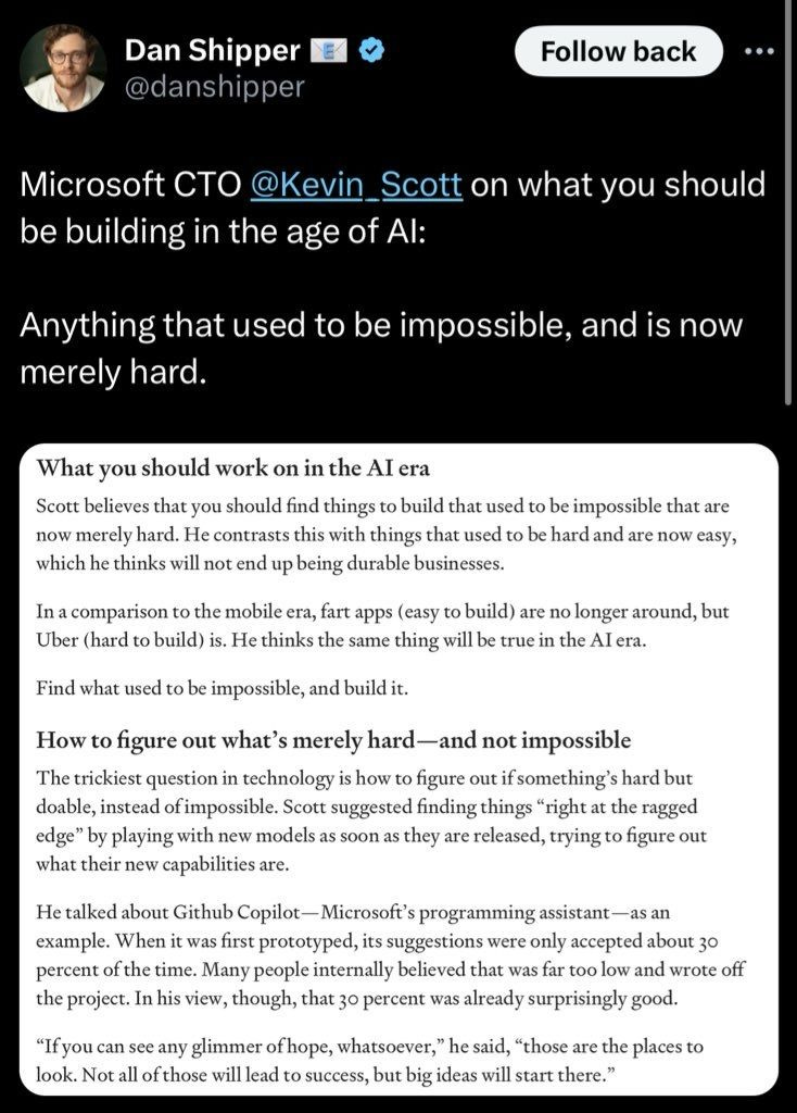 I like how succinct this is: AI has made things once impossible, hard. Not a panacea or something that will replace things entirely, at least not today.