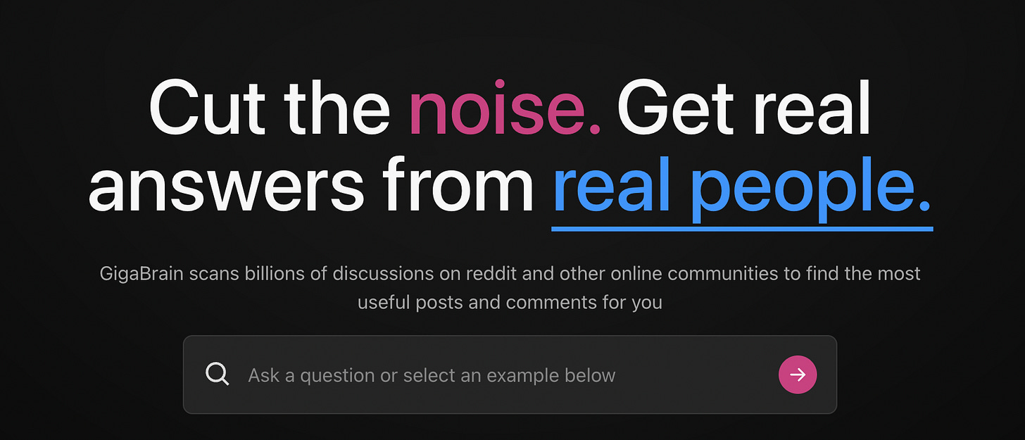 If you trust and love Reddit then Gigabrain might be something you’d appreciate and use! It scans billions of discussions (and other online communities) for answers.