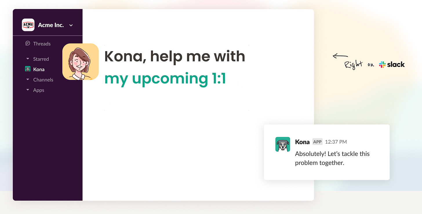 Kona is an AI-powered leadership coach for managers, helping them navigate difficult conversations, improve performance, and optimize meetings. It offers valuable insights and guidance, all conveniently integrated with Slack.