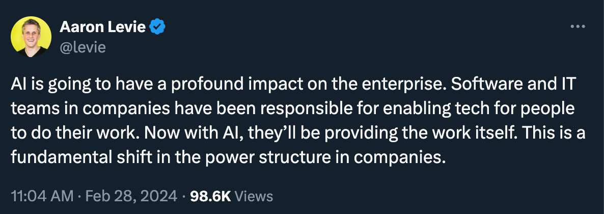 AI is going to have a profound impact on the enterprise. Software and IT teams in companies have been responsible for enabling tech for people to do their work. Now with AI, they’ll be providing the work itself. This is a fundamental shift in the power structure in companies.