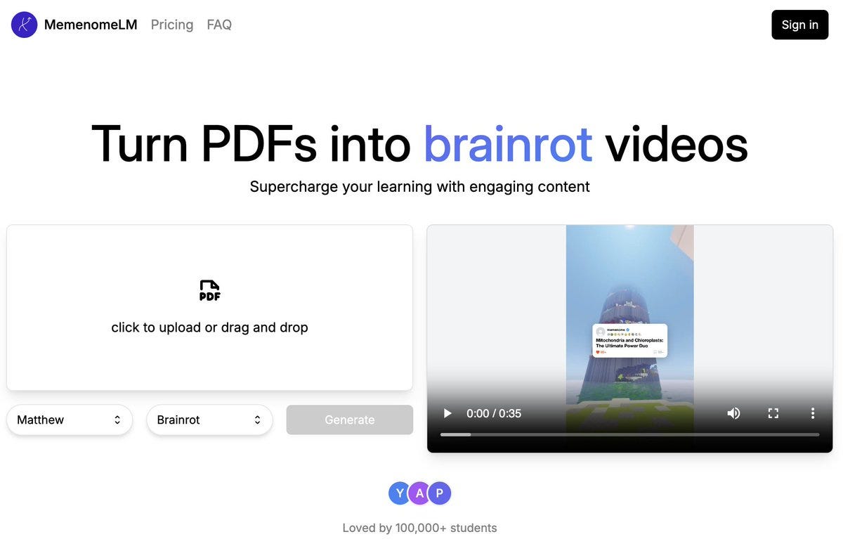 Turn PDFs into brainrot videos.