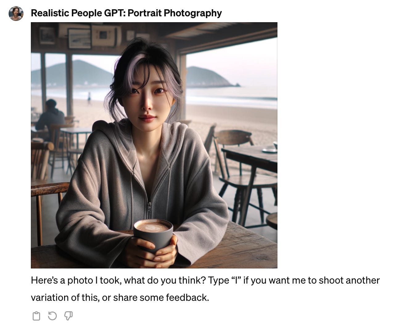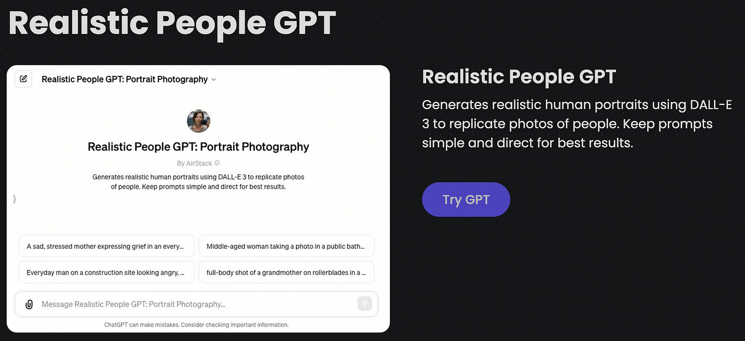 The first is a realistic people GPT that bills itself as a tool to generate (wait for it) realistic human portraits using DALLE-3.