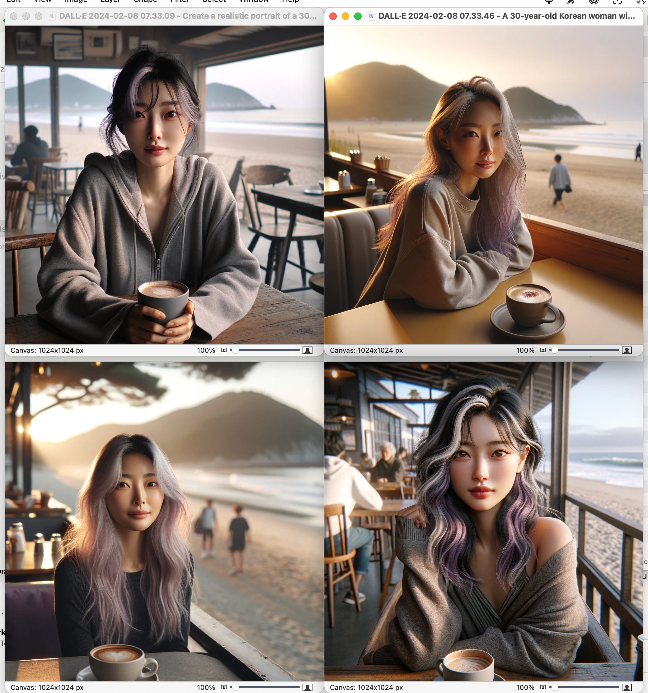 a 30 year old korean woman with light purple streaks in her hair sitting at a coffee shop with the beach in the background in the early morning, people in the background and a coffee cup at the table.