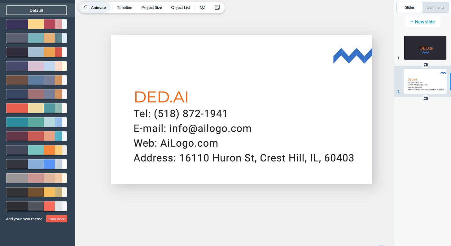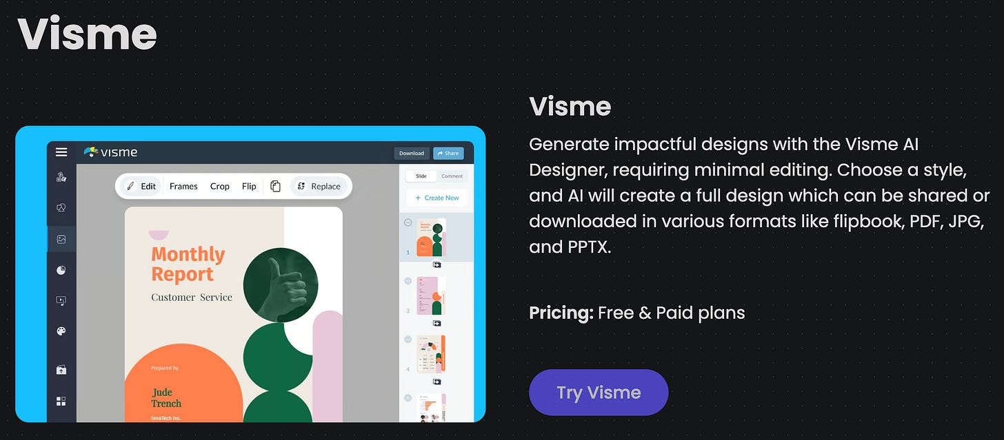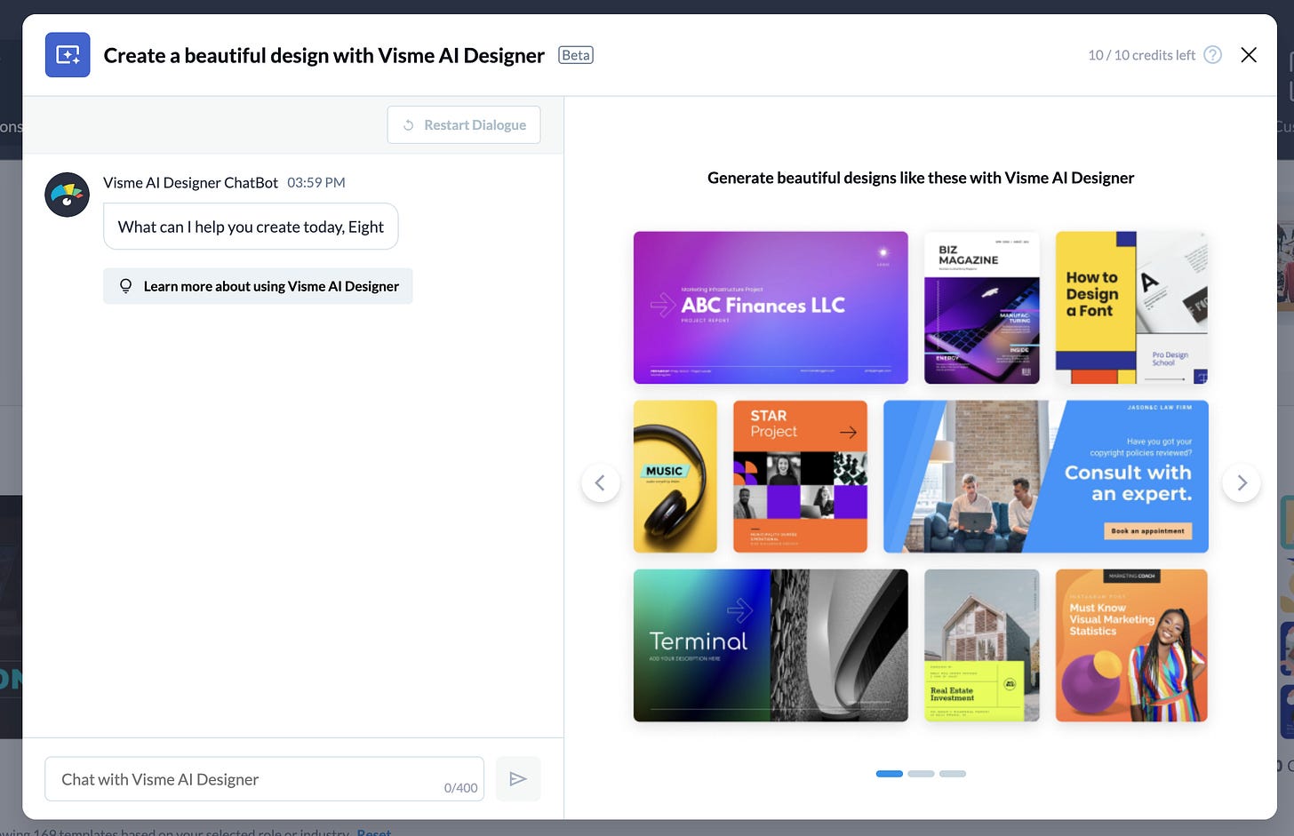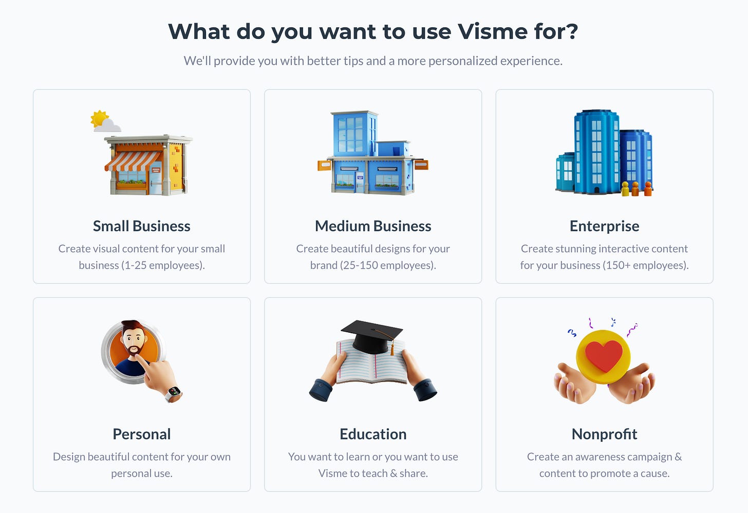 Visme uses AI to help you create a number of different designs for many different types of projects. Walking through the workflow and editor is very simple and they try to guide you quickly to some sample results, whether it’s for a small business, personal, education project, or non-profit: