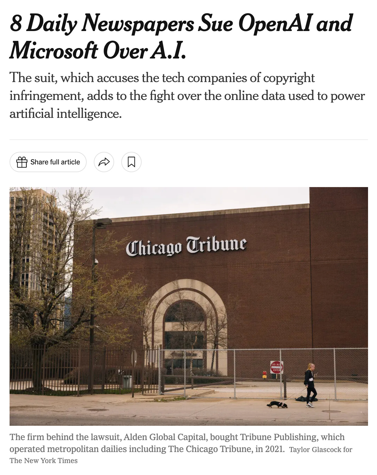 Eight daily newspapers owned by Alden Global Capital sued OpenAI and Microsoft on Tuesday, accusing the tech companies of illegally using news articles to power their A.I. chatbots.
