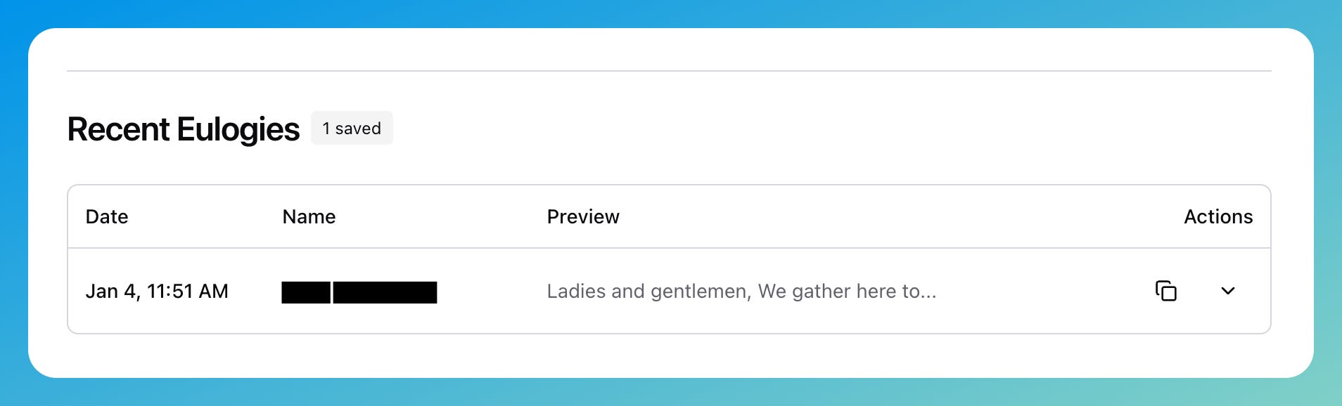 You can now view your past eulogy generations! Every time you use our AI to help draft something, it’s saved — timestamped, organized, scrollable. This wasn’t a requested feature, exactly. It came from a conversation with a user who mentioned they’d generated something beautiful, closed the tab, and couldn’t remember exactly what they’d written.