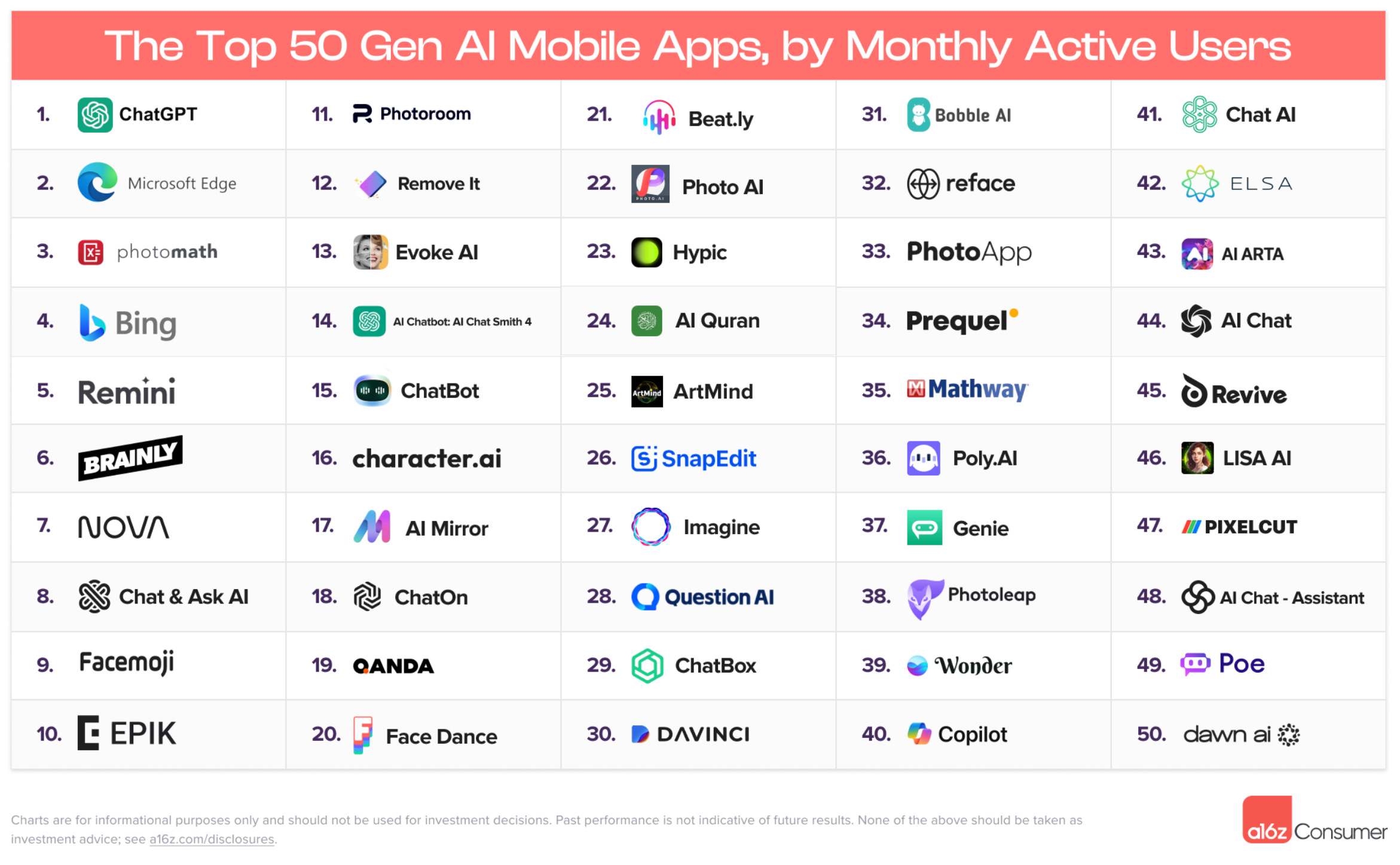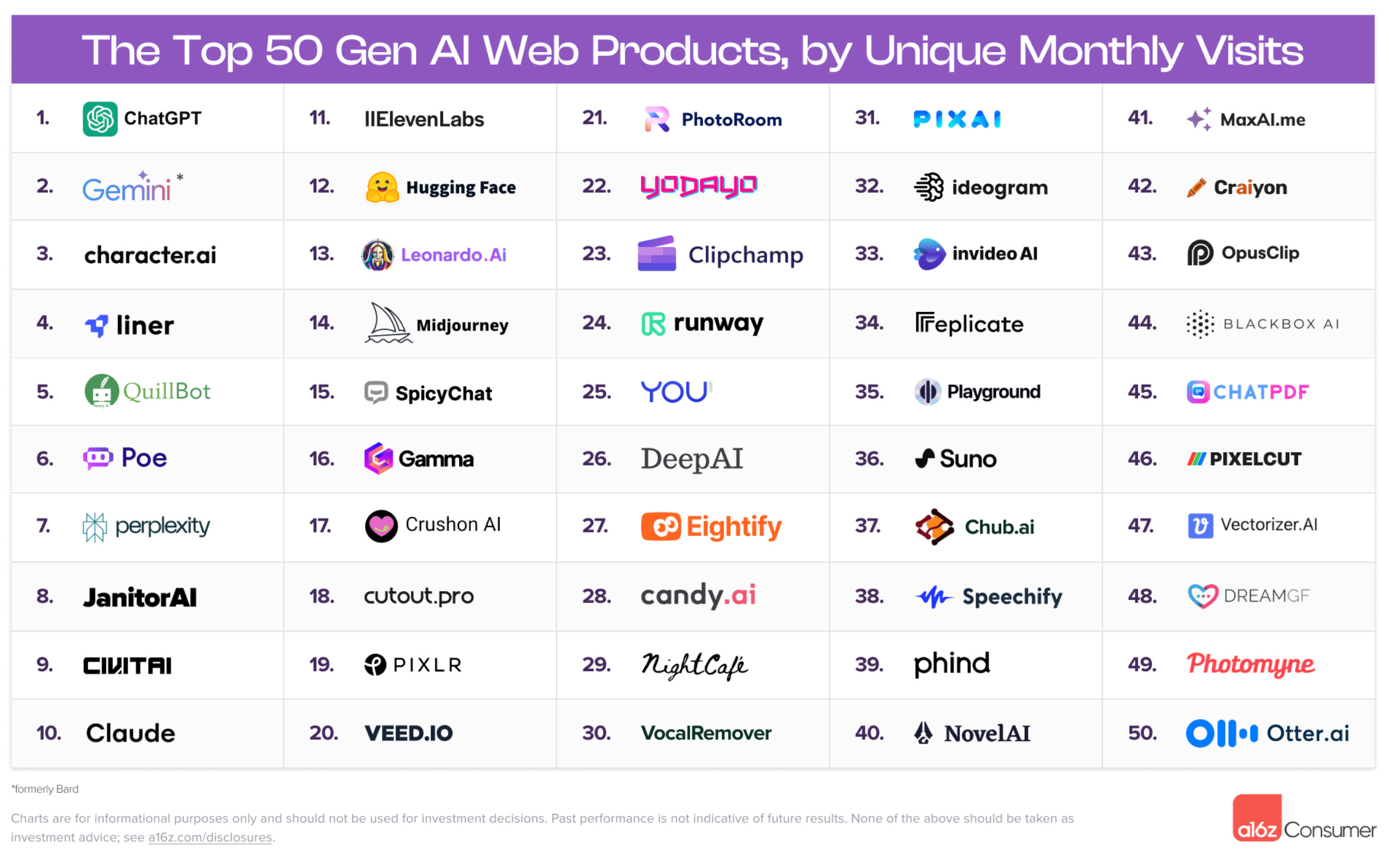 a16z shares the top 100 gen AI web products based on unique monthly visits. I haven’t heard of a handful of them so this was fun to review what people are really checking out with their most valuable asset — time.