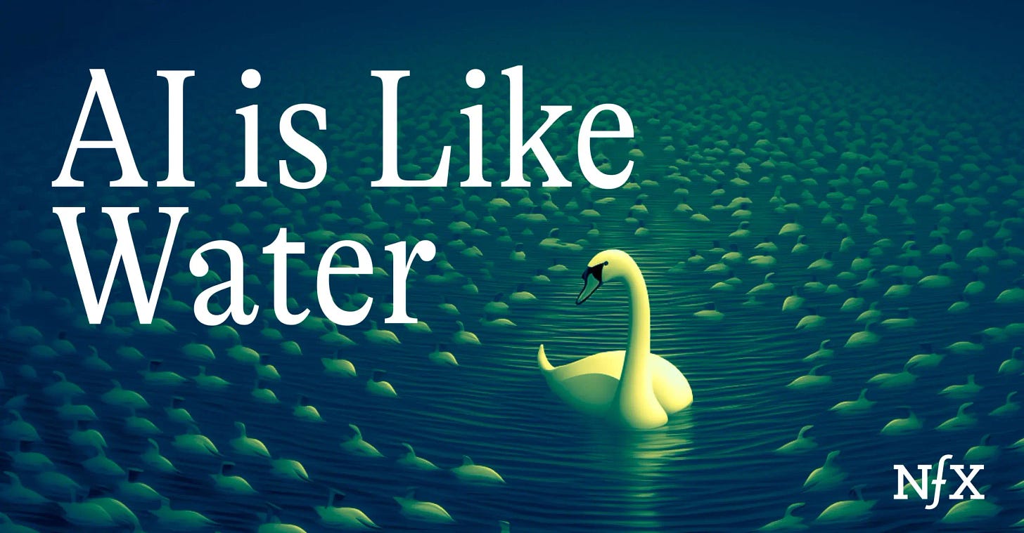 Technology alone is no longer enough to provide a competitive advantage for GenAI companies. This makes GenAI and bottled water similar, as the underlying product is essentially the same. The key differentiators must come from factors such as user experience, distribution, perceived value to customers, branding, and marketing.