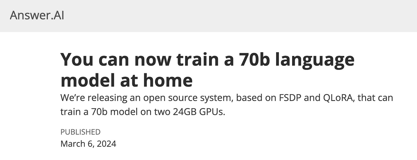 Today, we’re releasing Answer.AI’s first project: a fully open source system that, for the first time, can efficiently train a 70b large language model on a regular desktop computer with two or more standard gaming GPUs (RTX 3090 or 4090). This system, which combines FSDP and QLoRA, is the result of a collaboration between Answer.AI, Tim Dettmers (U Washington), and Hugging Face’s Titus von Koeller and Sourab Mangrulkar.