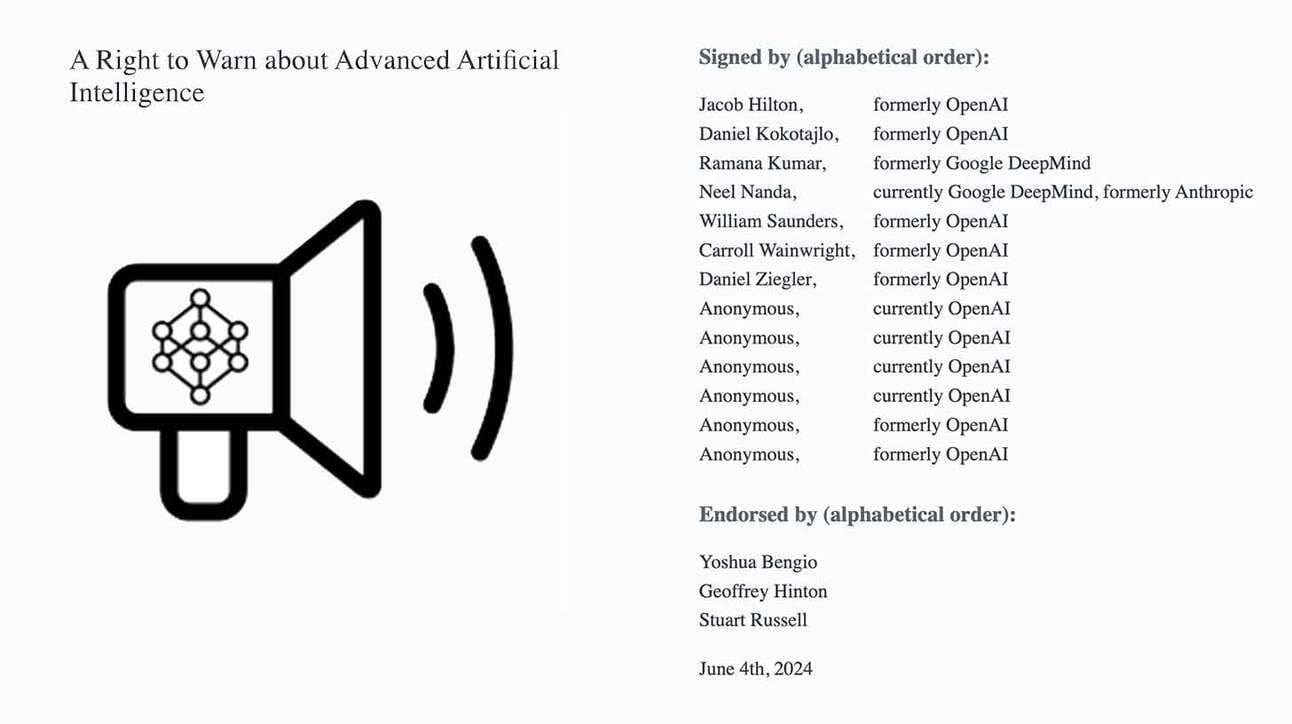 Current and former employees from OpenAI, Anthropic, and DeepMind just shared their thoughts in an open letter about whistleblower protections in AI. Probably a reasonable thought but will be difficult to put into practice. Thus the cat and mouse game begins with regulation.